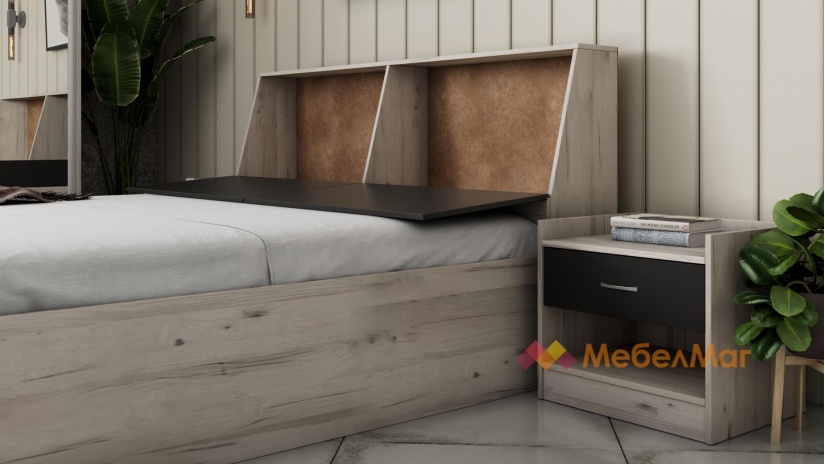 Разполагаш и с две нощни шкафчета с чекмедже и отворен рафт. На тях можеш да поставиш кокетна нощна лампа, любимата книга или ефектна декорация, за да създадеш още по-обаятелен интериор в спалнята.