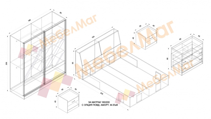Нощен шкаф (2 бр.): Д: 50 см Ш: 40 см В: 45 см