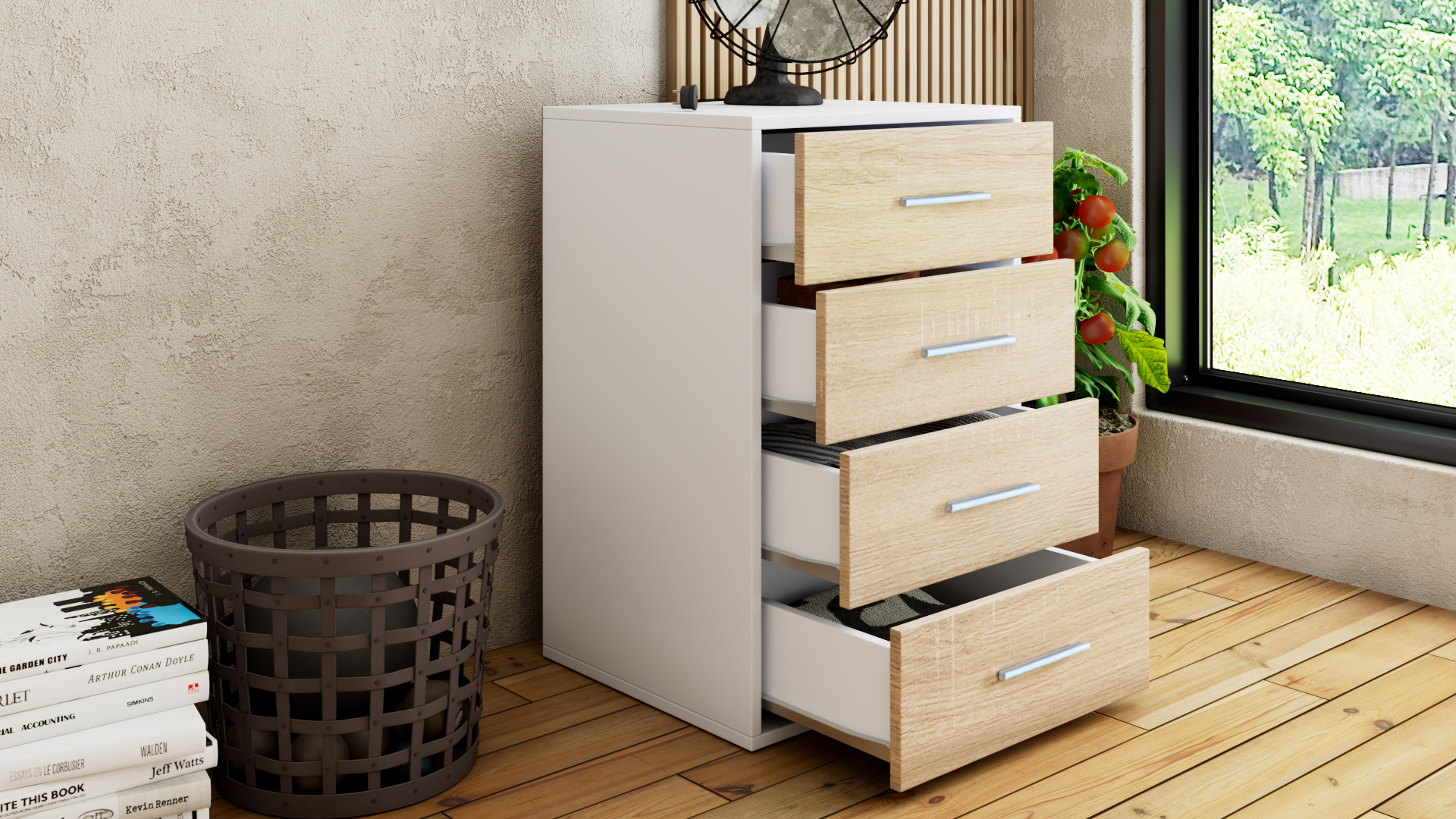 На твое разположение са четири чекмеджета, подходящи за организиране на дрехи, бельо, малки електроуреди, аксесоари или други необходими за теб неща. Плотът над чекмеджетата е идеален за подреждане на любимите ти фотографии, книги или други вещи, които да са ти винаги под ръка или да придадат допълнителен акцент на интериора.