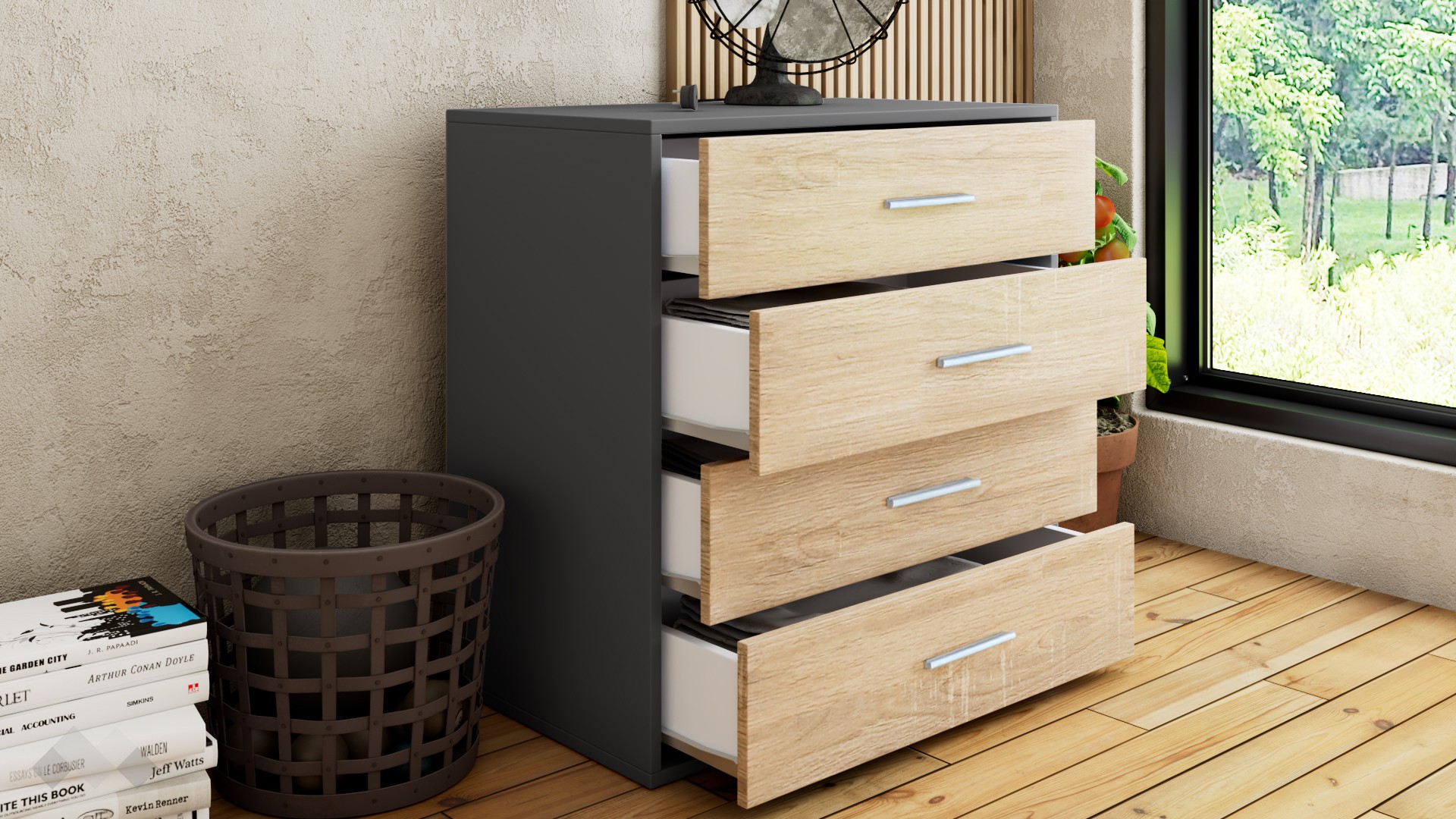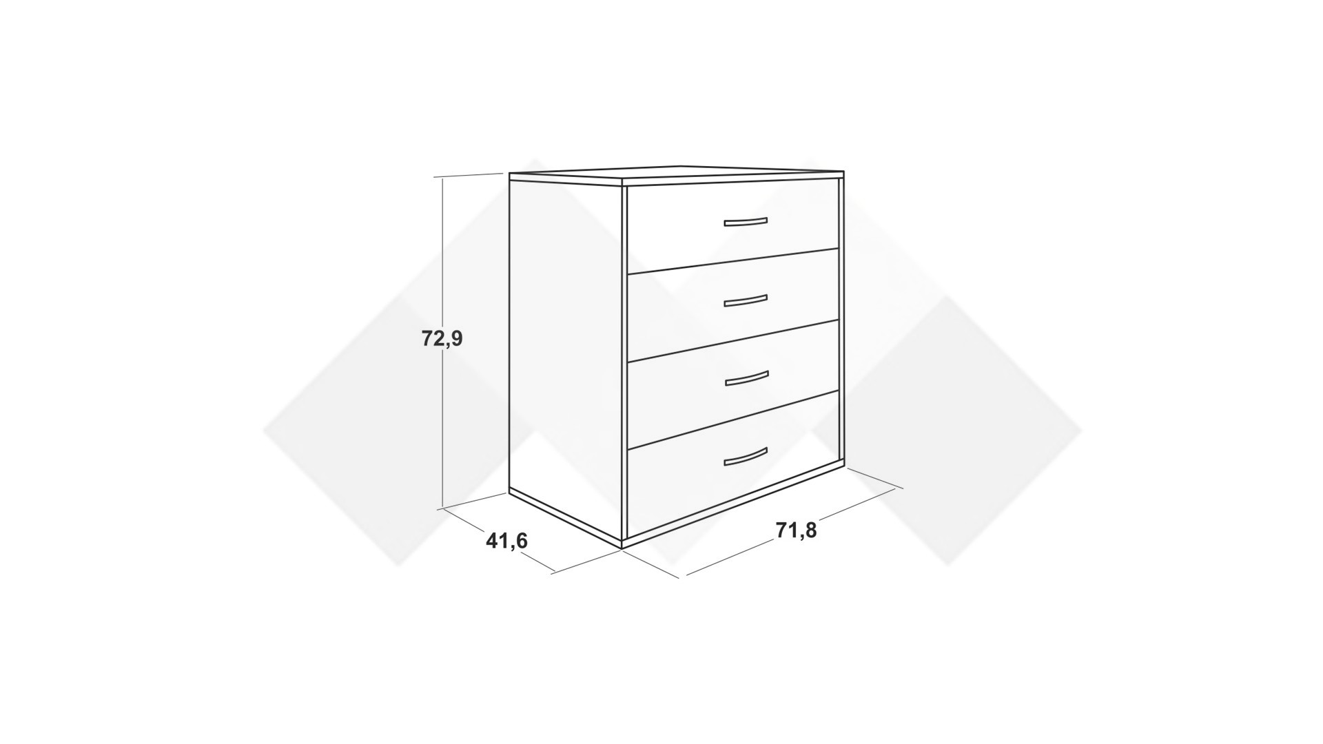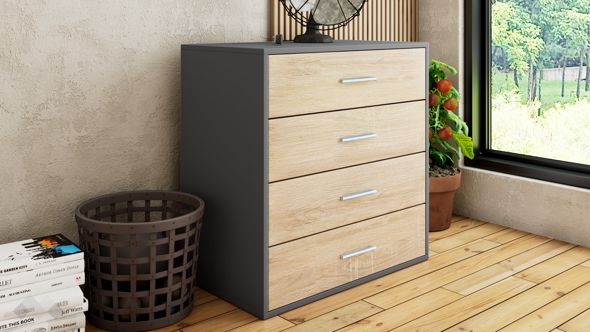 На твое разположение са четири чекмеджета, подходящи за организиране на дрехи, бельо, малки електроуреди, аксесоари или други необходими за теб неща. Плотът над чекмеджетата е идеален за подреждане на любимите ти фотографии, книги или други вещи, които да са ти винаги под ръка или да придадат допълнителен акцент на интериора.