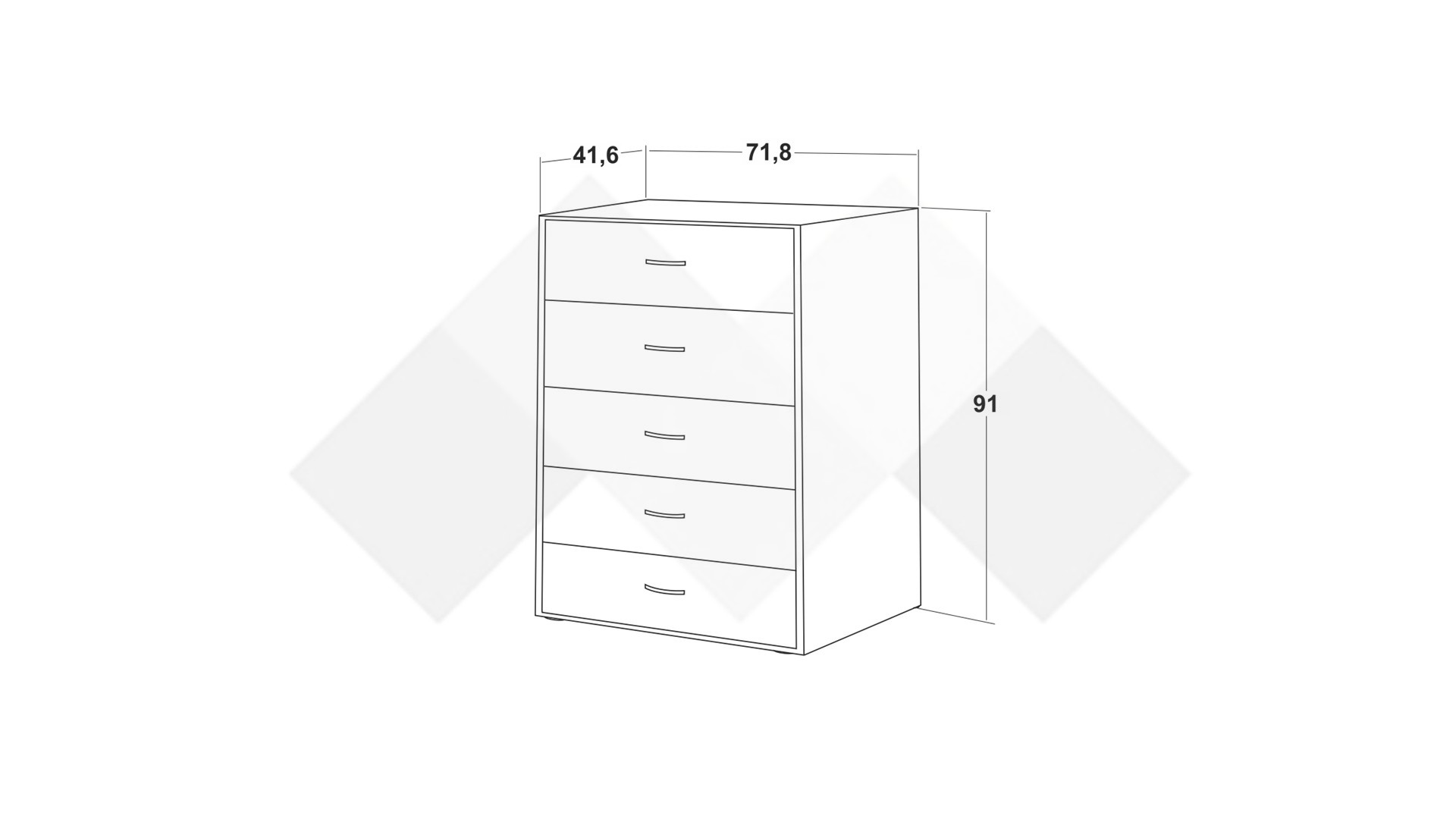 На твое разположение са пет чекмеджета, в които с лекота ще организираш голямо количество дрехи, бельо, аксесоари или други вещи. Горният плот е удобно място, където да поставиш фотографии, книги или сувенир за акцент.
