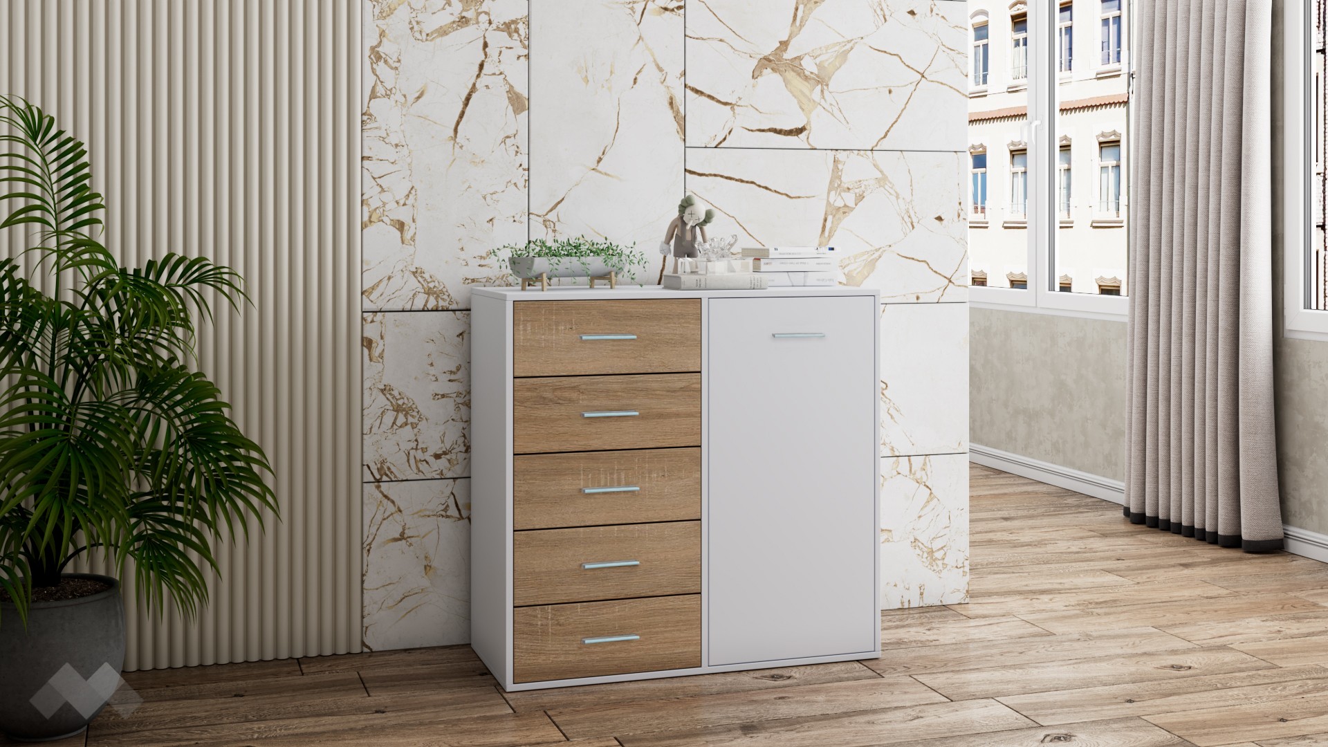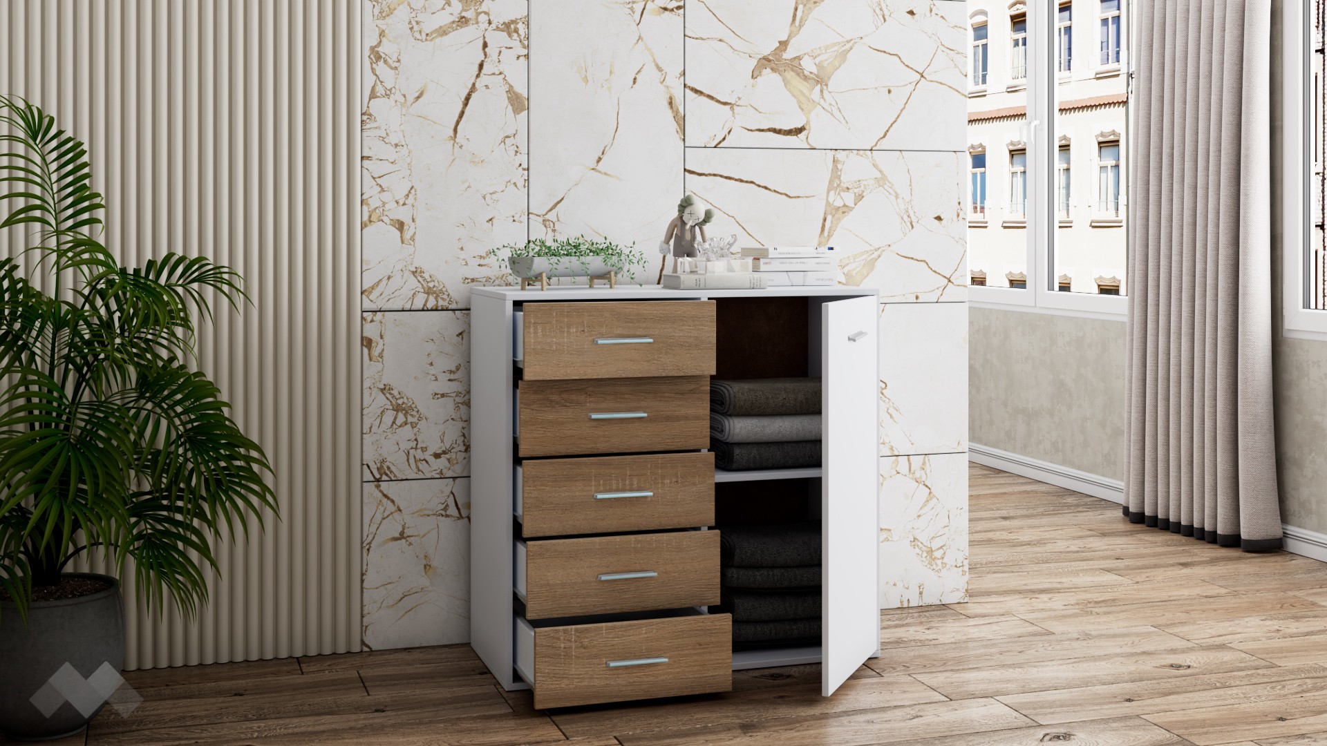 ⭐ Предимства: ✓ 5 чекмеджета ✓ затворен шкаф ✓ компактен и практичен ✓ модерен декор ✓ качествена изработка ✓ 16 мм ПДЧ