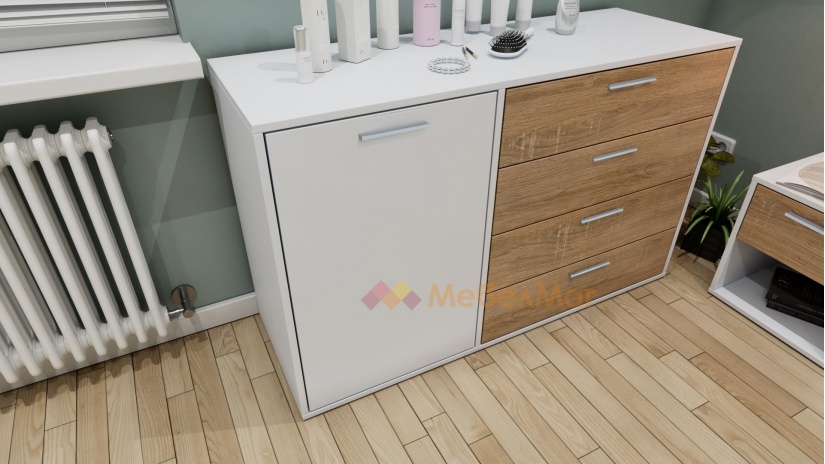 Скринът включва четири чекмеджета, които са подходящи за организиране на дрехи, бельо, аксесоари или други вещи. Отляво е разположен затворен шкаф, който ти предоставя допълнително място за съхранение. Горният му плот предоставя място за подреждане на снимки, декорации или любими предмети, добавяйки акцент към интериора.