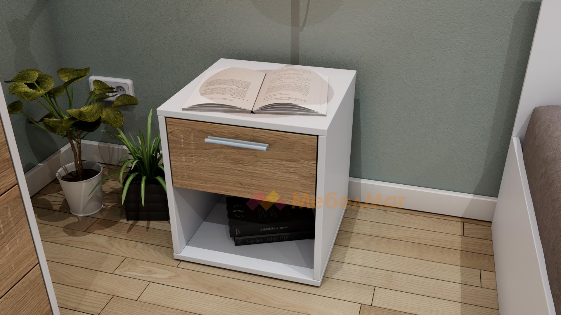 Нощните шкафчета са малки, но функционални. Благодарение на оптималната им височина, те ще паснат перфектно във всяка спалня. Разполагат с чекмедже и отворен рафт, осигуряващи място за съхранение на всички необходими вещи, които трябва да са винаги подръка. Горният им плот е идеален за нощна лампа или книги.