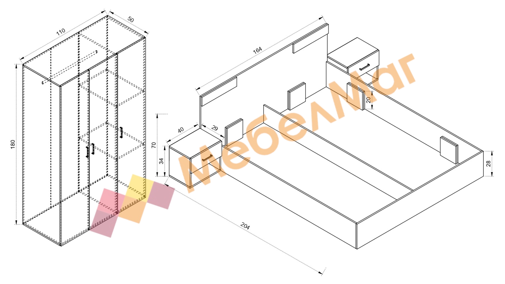 Спалня: Д: 204 см Ш: 164 см В: 70 см