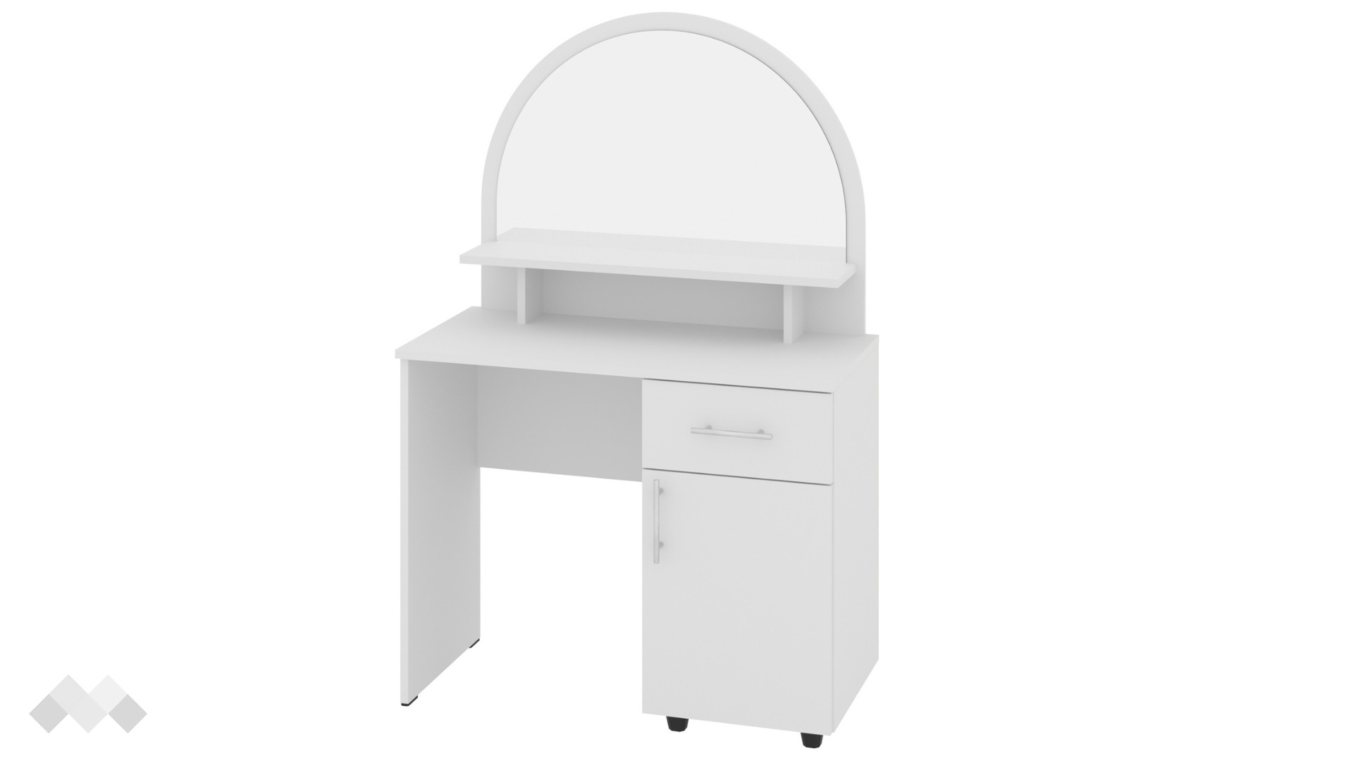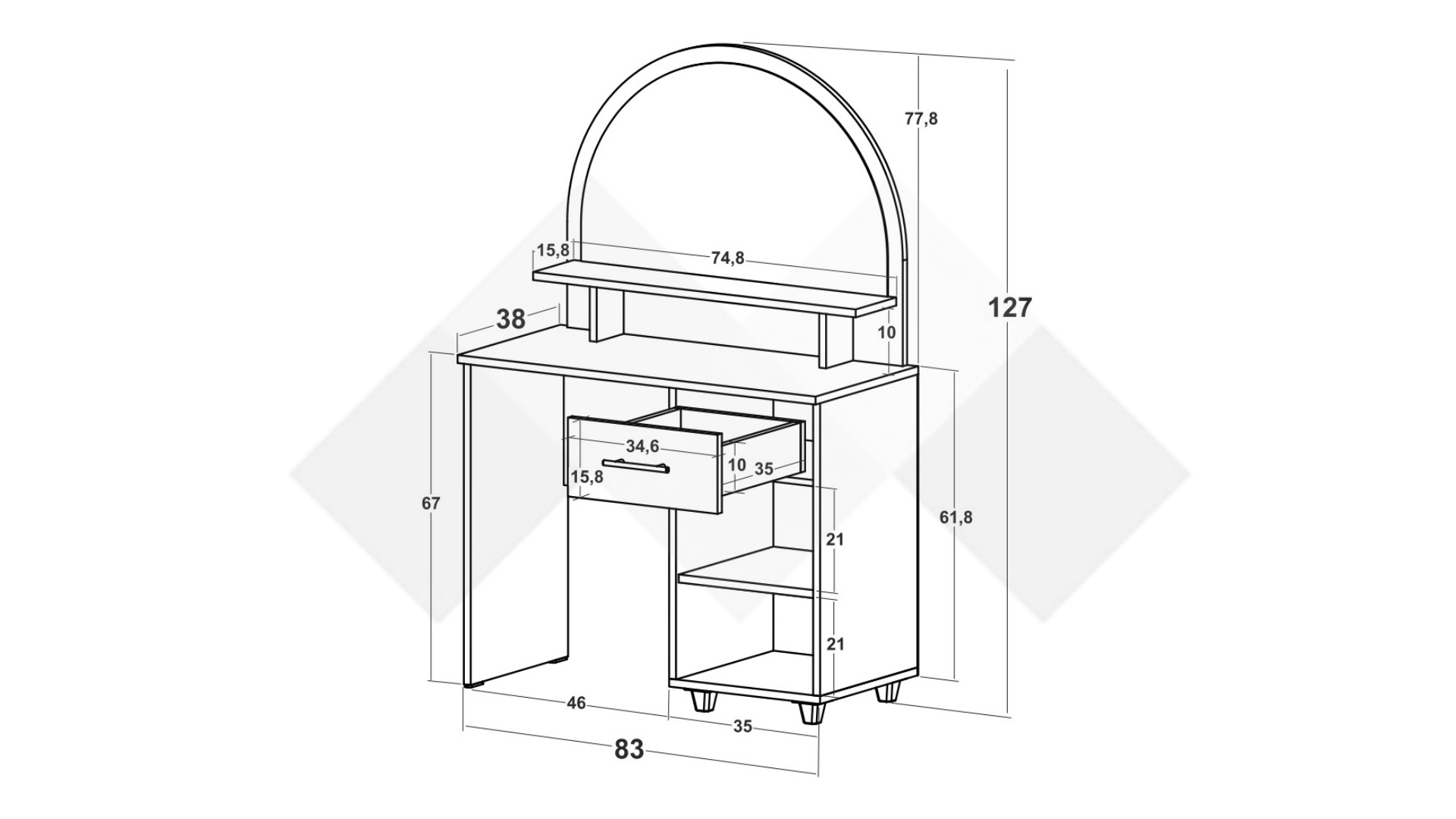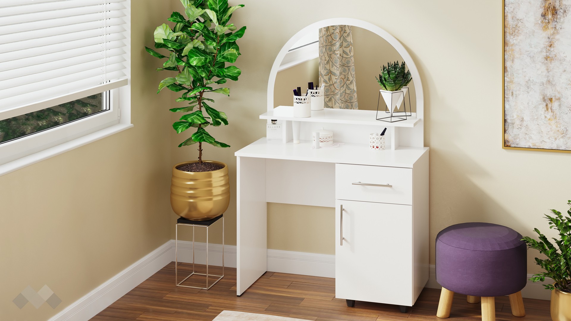 Тоалетката разполага с едно чекмедже и един шкаф с врата, които осигуряват достатъчно място за съхранение на козметика, аксесоари и всичко необходимо за твоята красота. Допълнителното рафтче на второ ниво предлага практично решение за подреждане на парфюми, декорации или малки аксесоари.