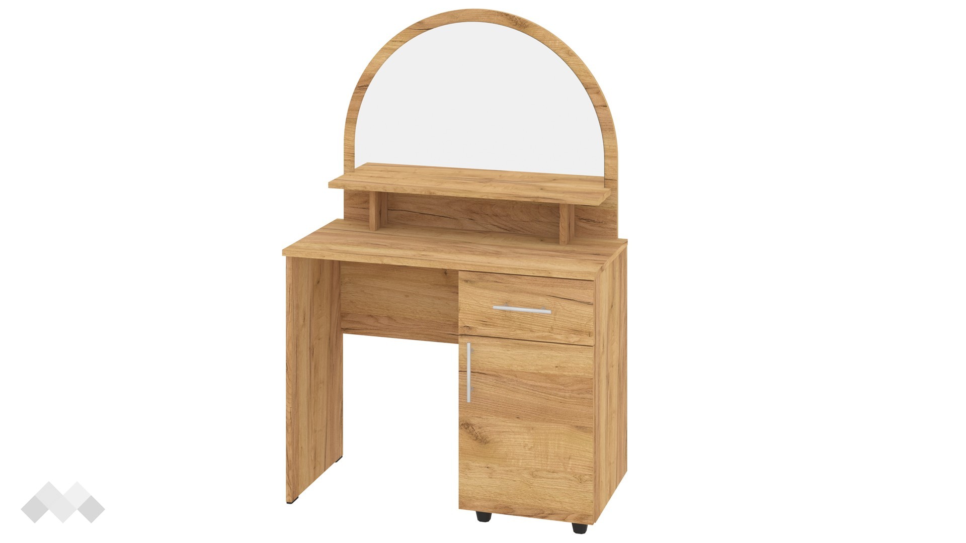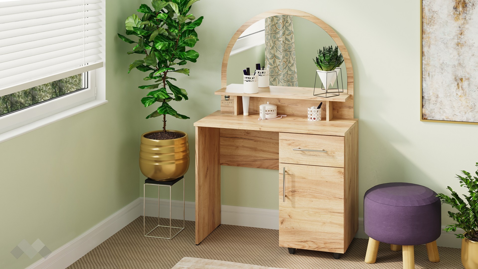 Тоалетката разполага с едно чекмедже и един шкаф с врата, които осигуряват достатъчно място за съхранение на козметика, аксесоари и всичко необходимо за твоята красота. Допълнителното рафтче на второ ниво предлага практично решение за подреждане на парфюми, декорации или малки аксесоари.
