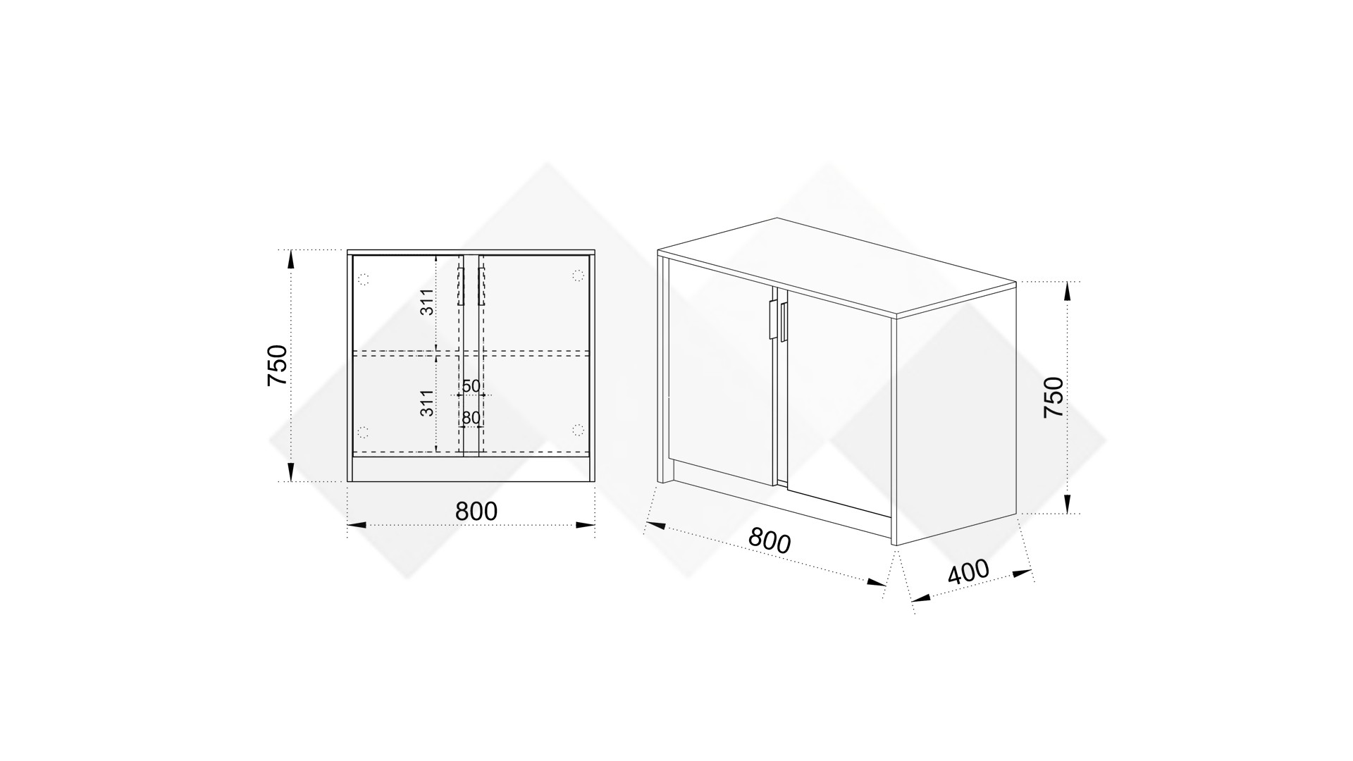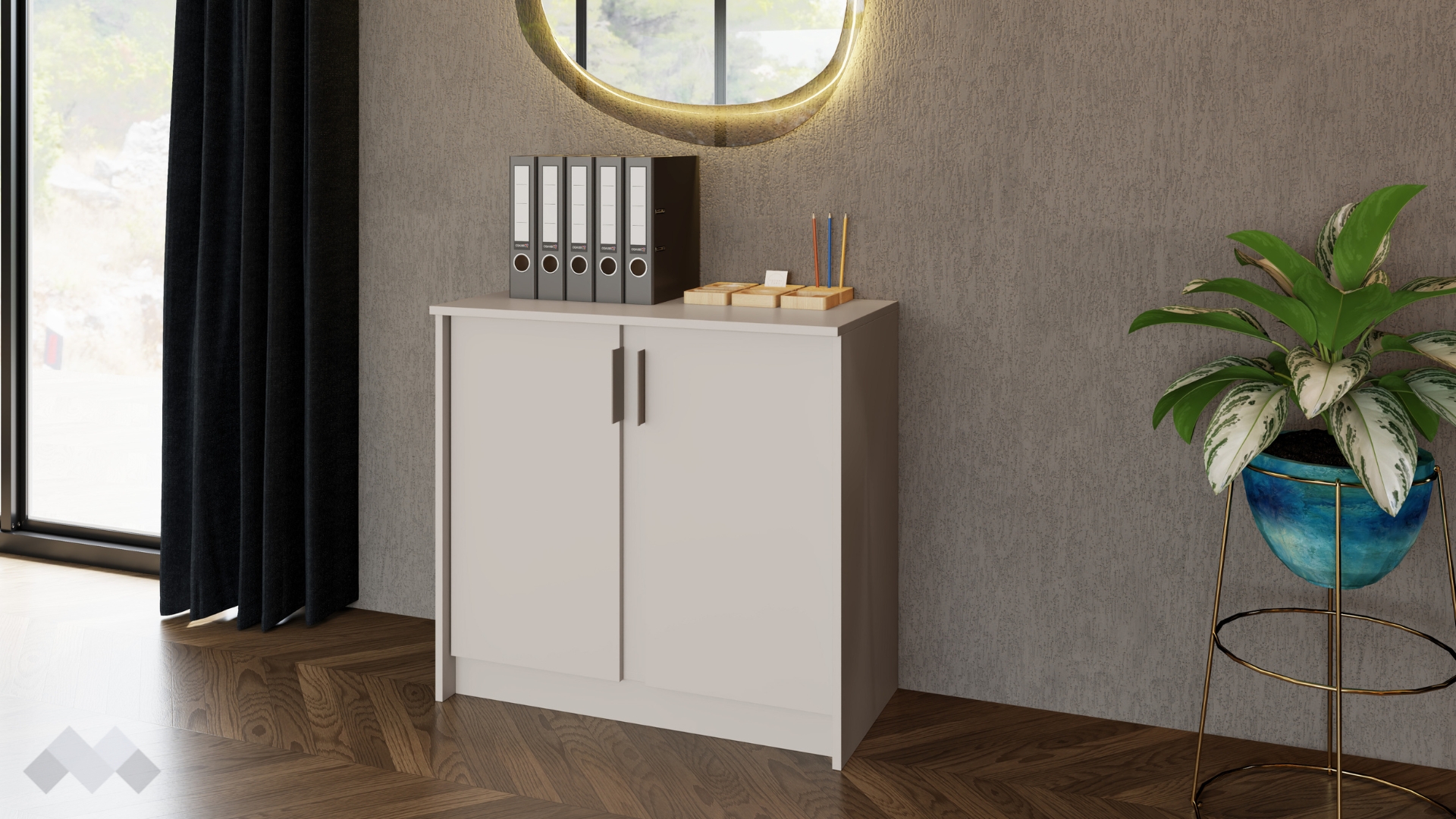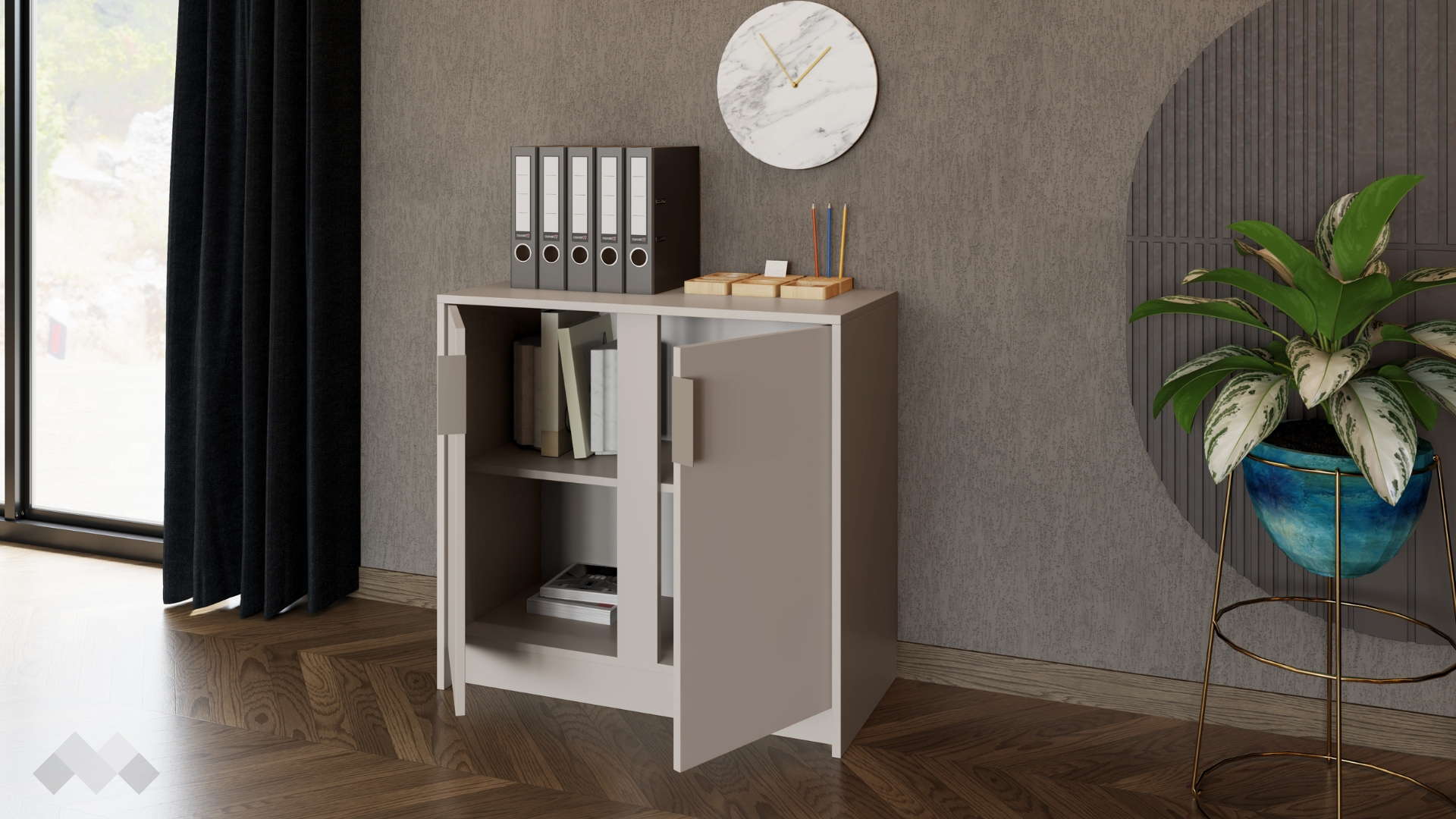 Шкафът е оборудван с две вратички, които се отварят плавно и ти осигуряват скрито, защитено място за съхранение. Вътре разполагаш с един удобен рафт, който ти позволява да разделиш пространството и да организираш документи, папки, офис консумативи или лични вещи по твой вкус.