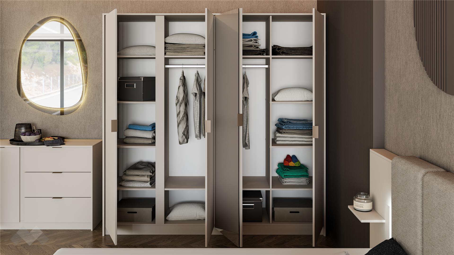 Четирикрилният гардероб е проектиран с мисъл за максимално удобство и практичност. Разположеното огледало на вратата не само добавя функционалност, но и визуално разширява пространството. Просторните рафтове и лостът за закачалки осигуряват перфектната организация на дрехите. Със своето елегантно излъчване и фини детайли, този гардероб е не само практичен, но и стилен елемент, който добавя завършеност на твоята спалня.