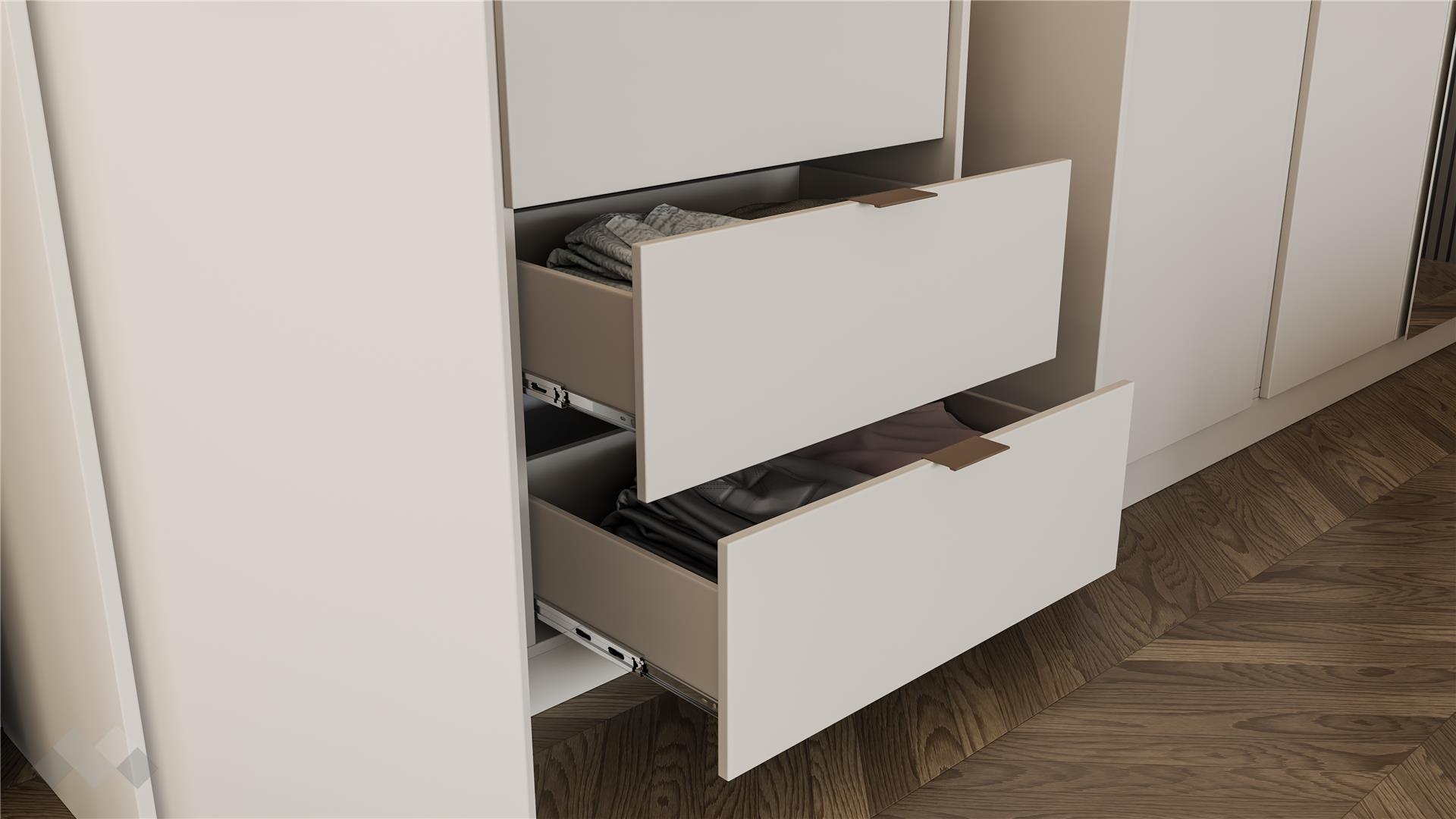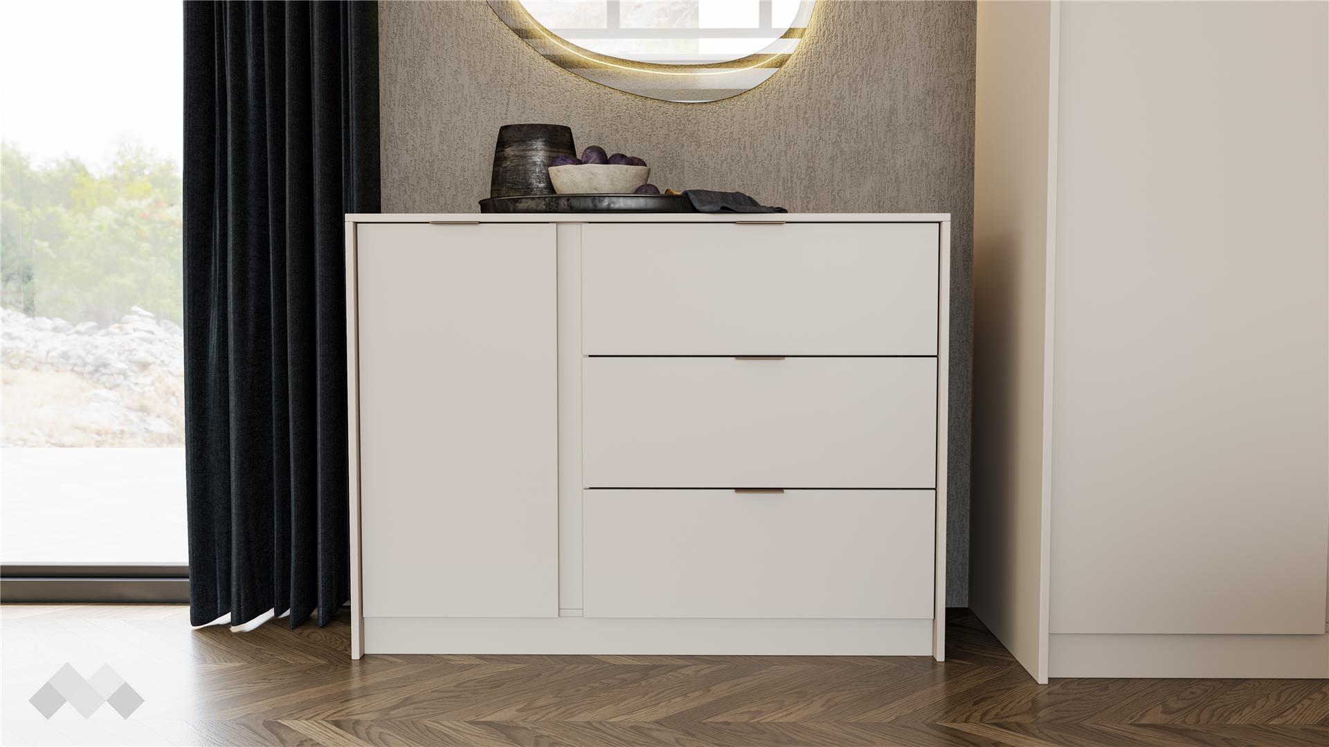 Скринът с три чекмеджета и един шкаф допълва комплекта и предоставя достатъчно място за съхранение на лични вещи, козметика и други. Чекмеджетата са снабдени със сачмени водачи с пълно изтегляне, които осигуряват пълен достъп до съдържанието и гарантират дълготрайна устойчивост.