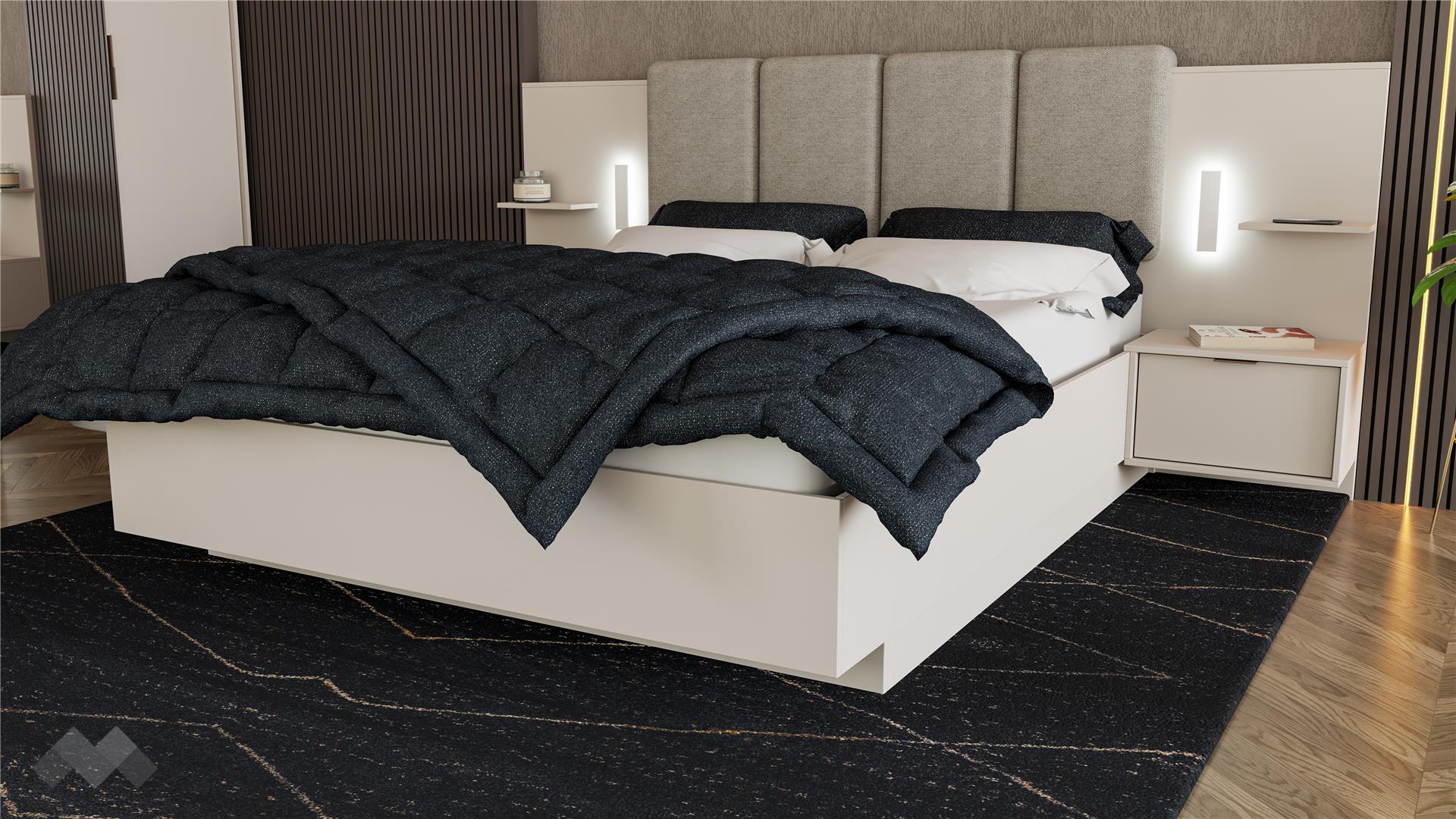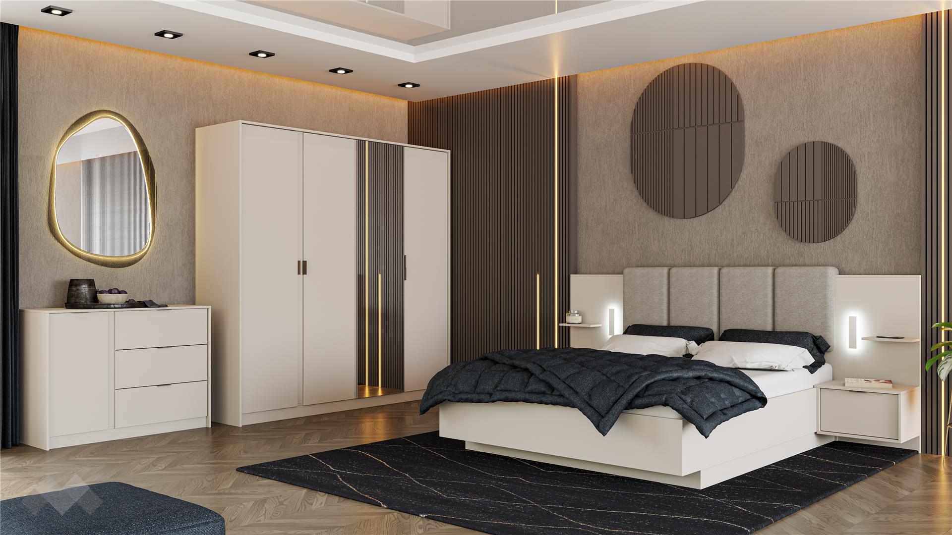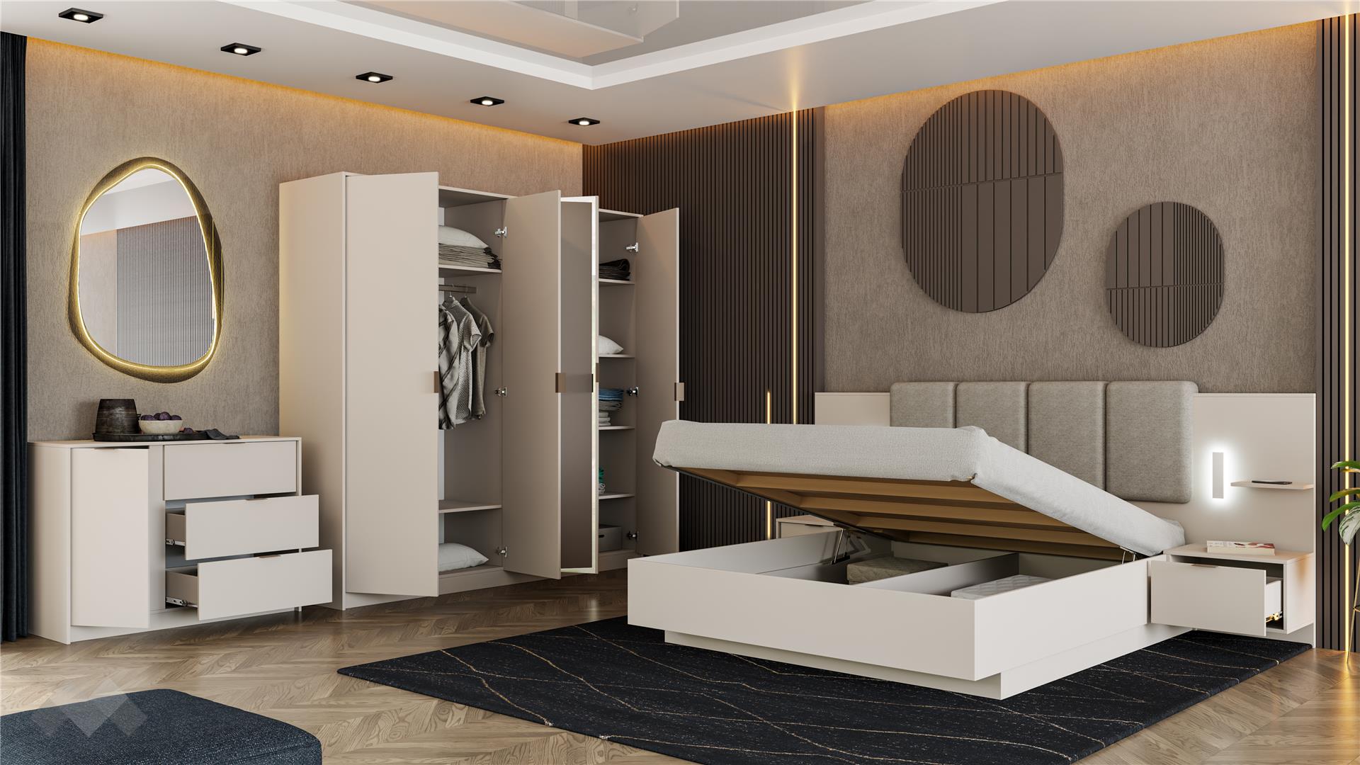 Основният акцент в комплекта е спалнята, която е предназначена за матрак 160/200. Тапицираната табла в светли тонове, висока 110 см придава луксозен завършек и осигурява удобство при четене или гледане на телевизия. Вграденото LED осветление е не само стилно, но и функционално, като елиминира нуждата от допълнителни нощни лампи.Включеният повдигащ мехaнизъм позволява лесен достъп до пространството под матрака, предоставяйки възможност за съхранение на вещи и багаж, което е особено полезно в малки пространства.