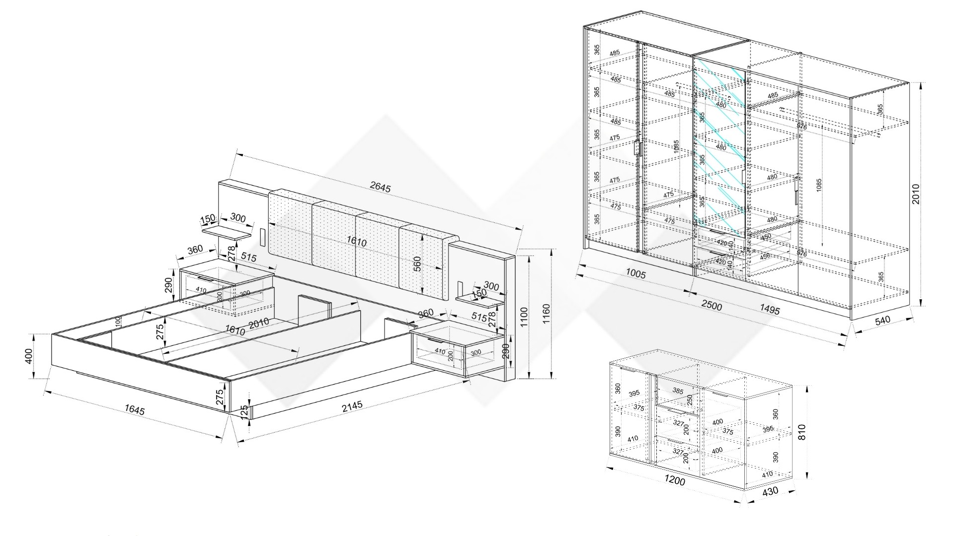 Спалня: Д: 214,5 см Ш: 264,5 см В: 116 см