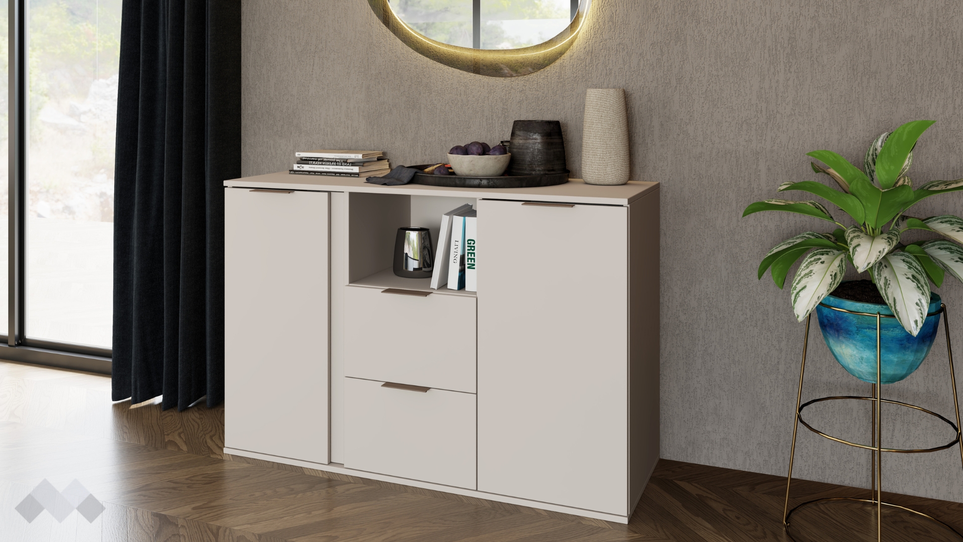 Скринът разполага с два шкафа с вътрешни рафтове, подходящи за дрехи, бельо или други вещи, както и с две удобни чекмеджета за малки предмети – документи, ключове, аксесоари. Откритият рафт е идеален за вещи, които искаш да бъдат винаги под ръка, а горният плот може да се използва както декоративно, така и практично.