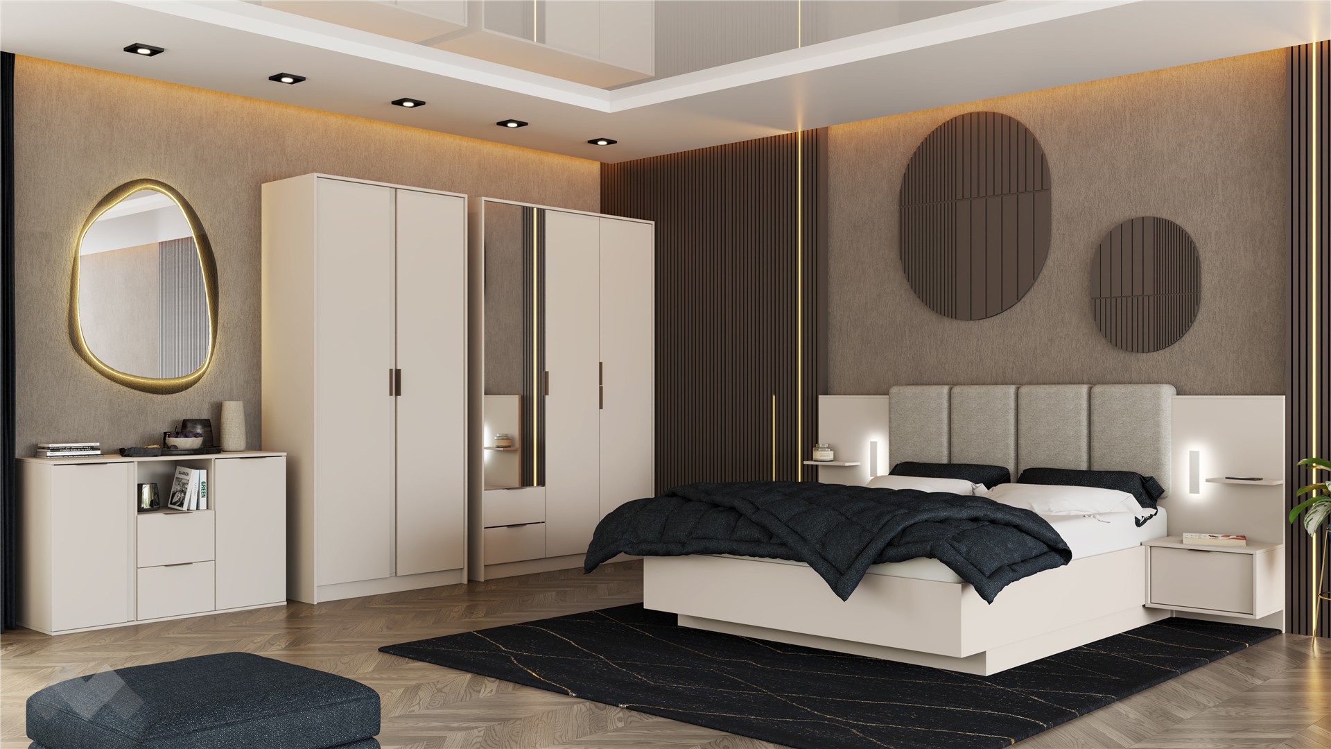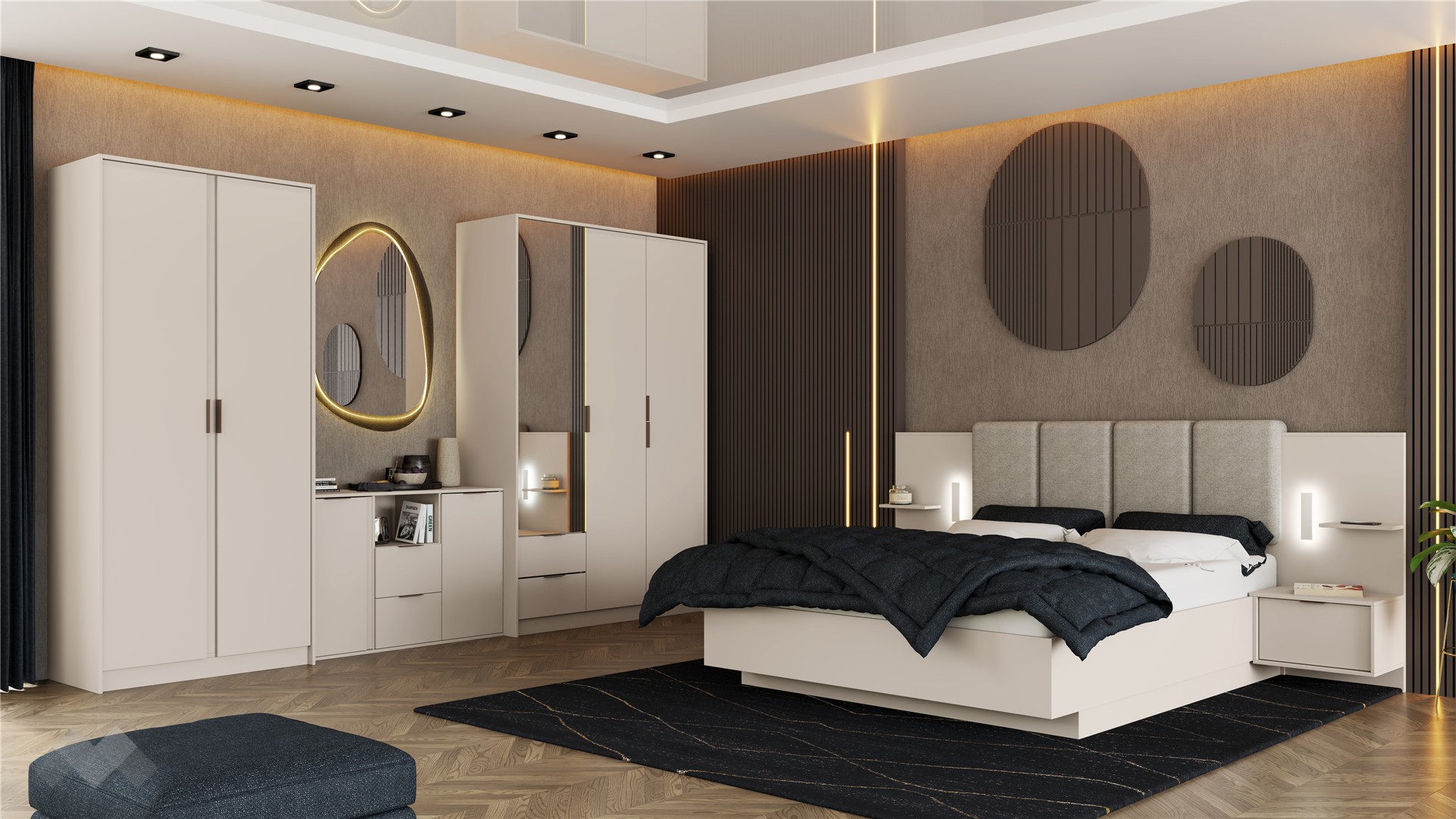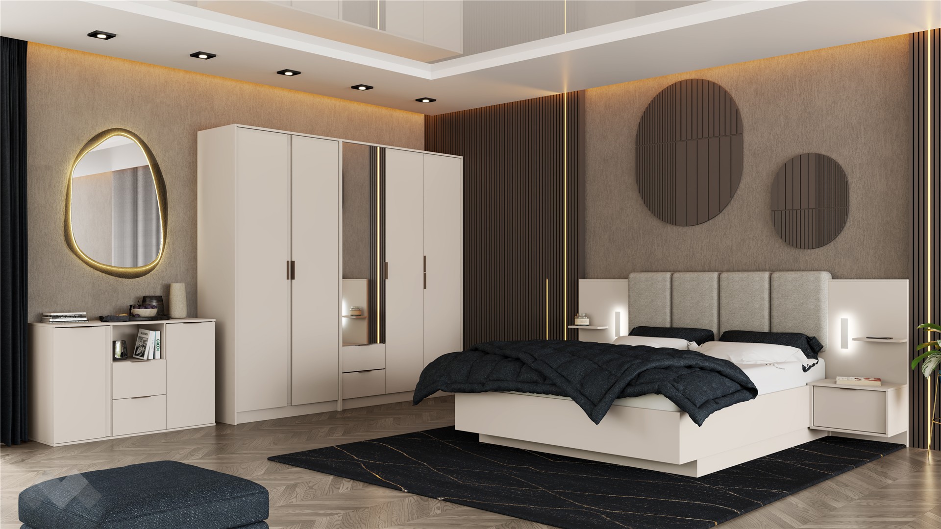 ✓ 16 мм ПДЧ ✓ спалня за матрак 160/200 ✓ тапицирана табла ✓ LED осветление ✓ 2 нощни шкафчета ✓ петкрилен гардероб ✓ скрин ✓ практично разпределение ✓ механизъм за плавно затваряне ✓ качествена изработка ✓ модерен и функционален дизайн