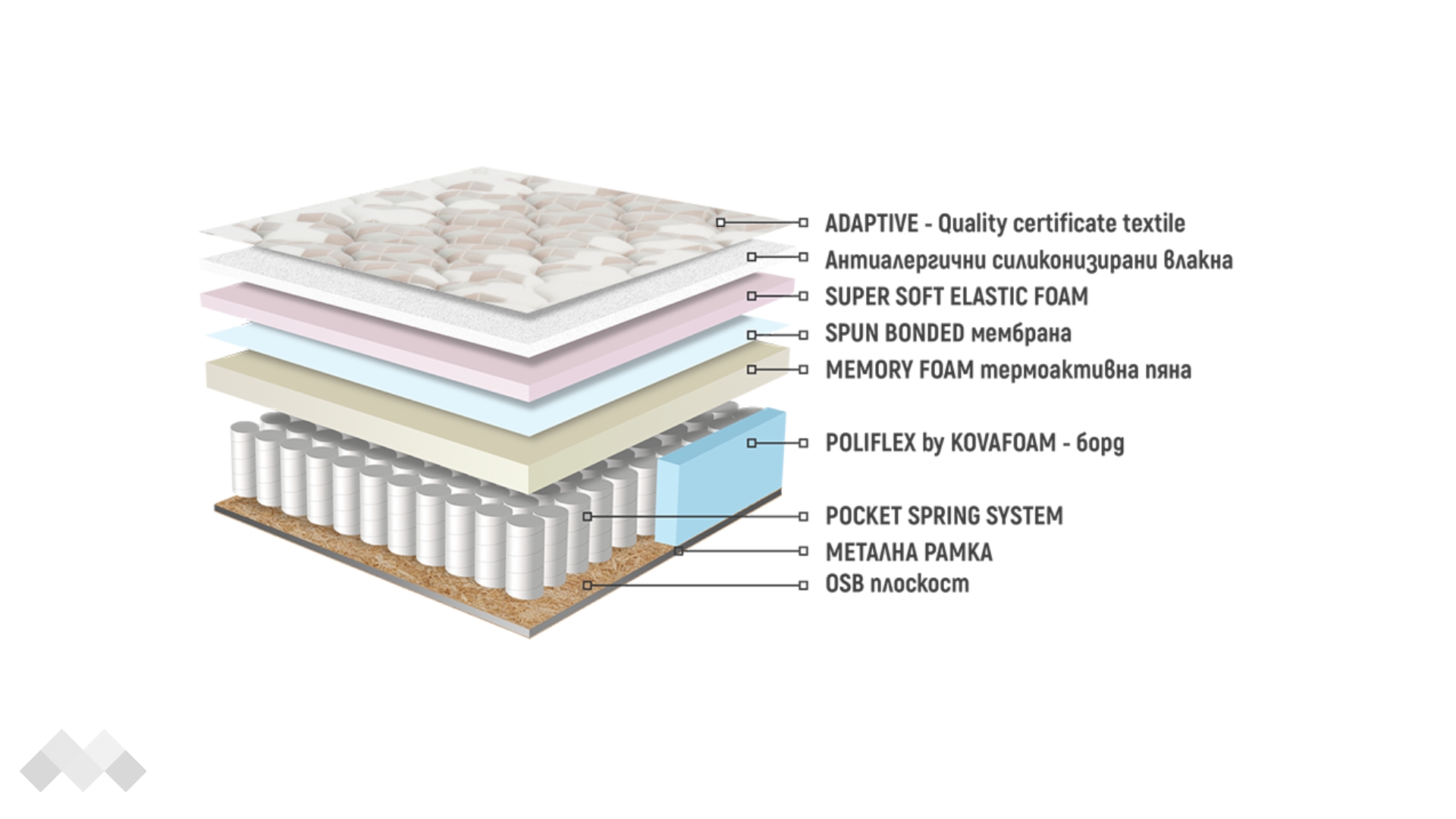 Матраци НАНИ са сред топ производителите на пазара, защото предлагат всичко, необходимо за наистина качествения сън - прецизна изработка, първокласни материали и изобилие от модели за малки и големи. Един от най-популярните им модели е еднолицев матрак Kaspia Relax Memory Pocket или още познат и като Каспия Visco Pocket Spring. Това е отличен вариант за търсещите матрак със средно ниво на твърдост. Невероятната комбинация от термоактивна мемори пяна и индивидуални покет пружини е сред най-предпочитаните, защото освен комфорт, осигурява и правилно позициониране на гръбнака. Pocket пружините са с компактен диаметър и са защитени от стабилизираща рамка от KOVAFOAM пяна.