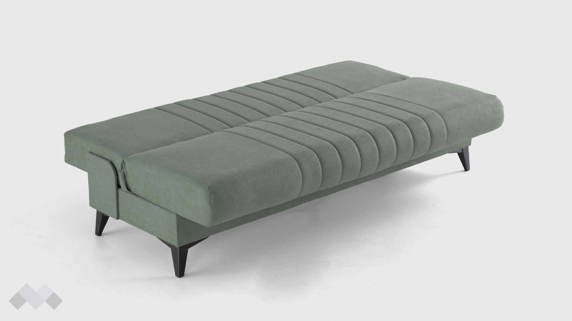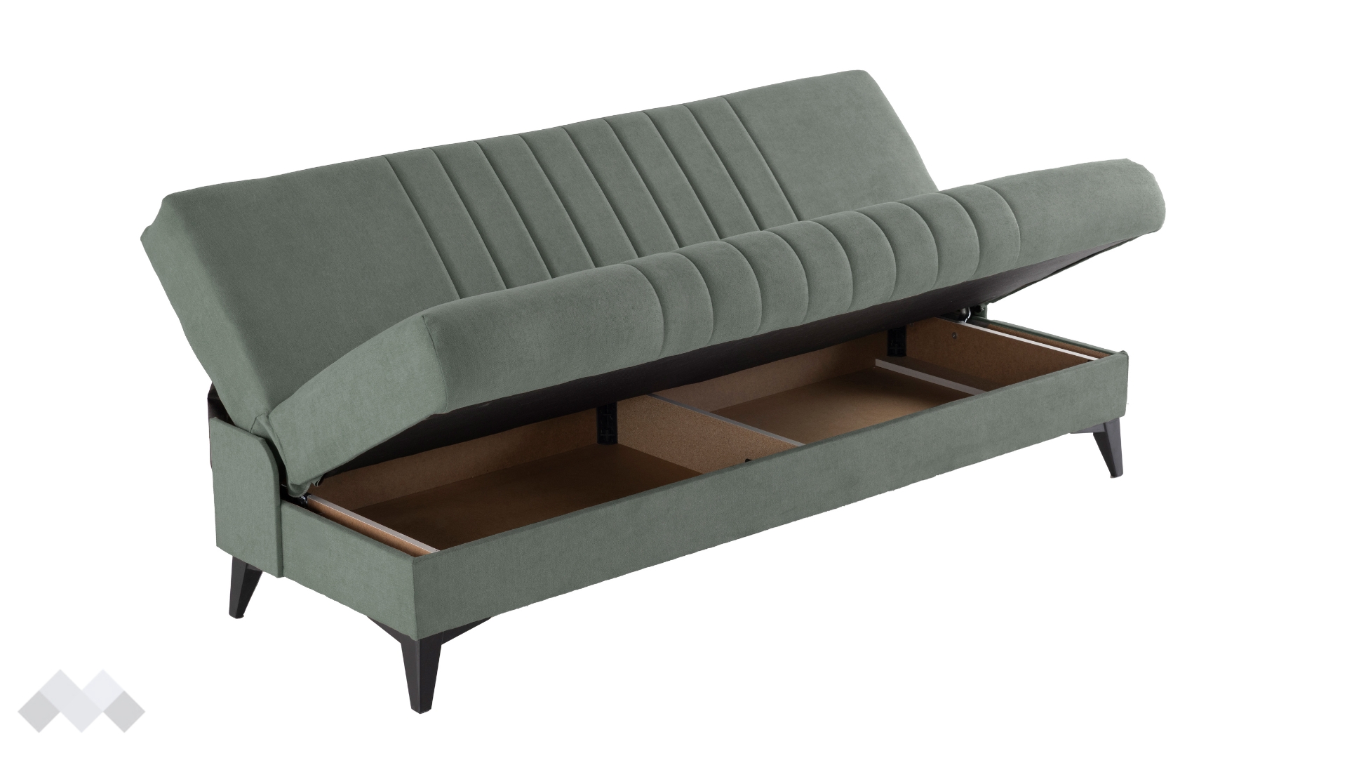 Подлакътниците са оформени с възглавници, които лесно се отстраняват при нужда, за да разширят използваемата площ. Това прави канапето още по-функционално и удобно при посрещане на гости или при необходимост от кратка почивка през деня. Просторната ракла под седалката осигурява допълнително място за съхранение на спално бельо, завивки и други вещи.
