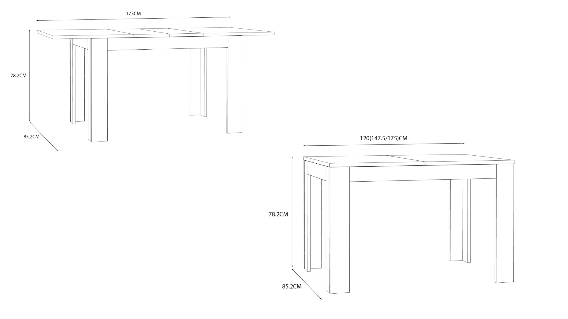Моделът разполага с разтегателен механизъм, който увеличава дължината на плота от 120 до 175 см – достатъчно пространство за комфортно настаняване на повече хора. Плавният преход между двете позиции прави масата удобна и лесна за използване.