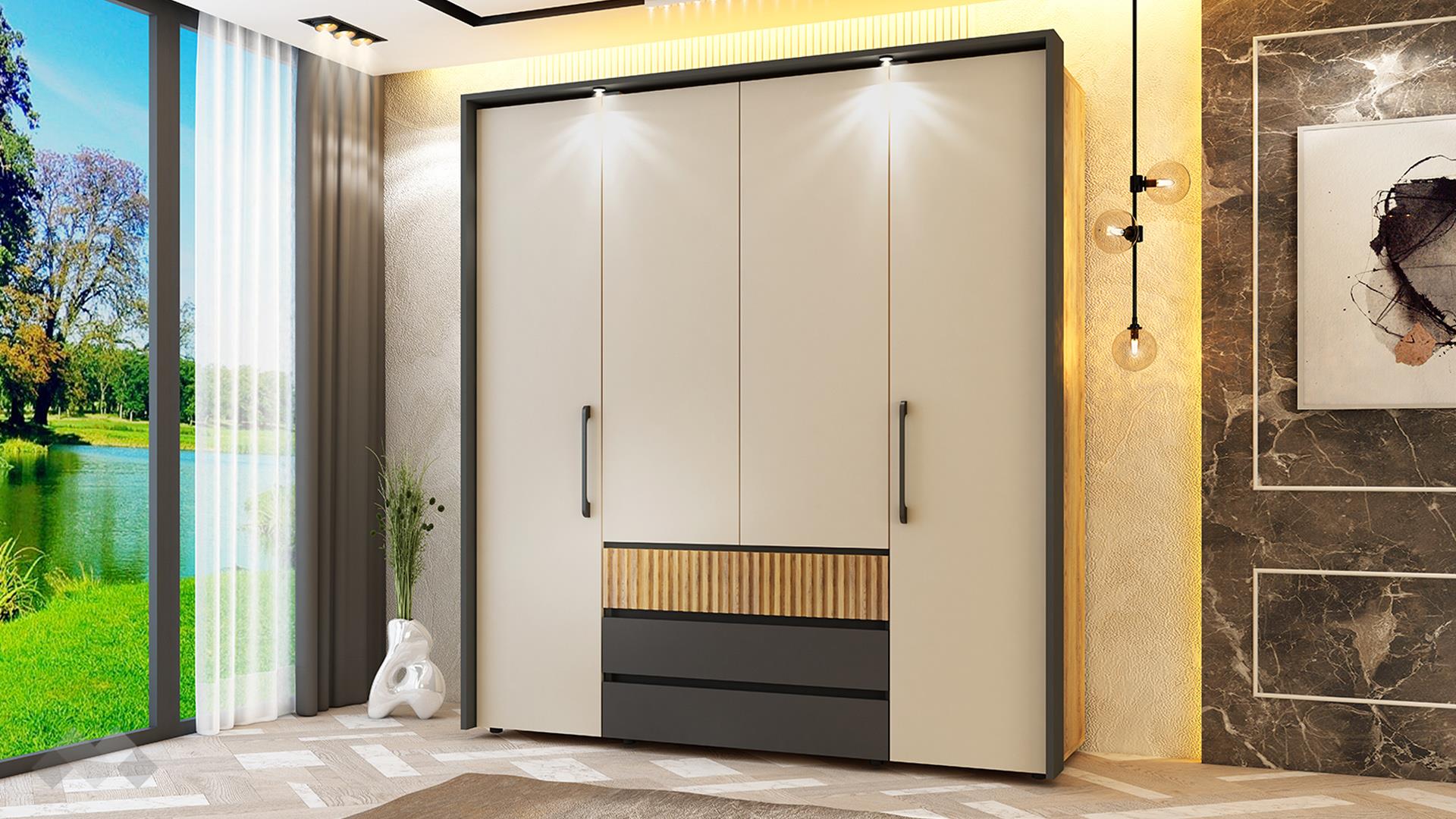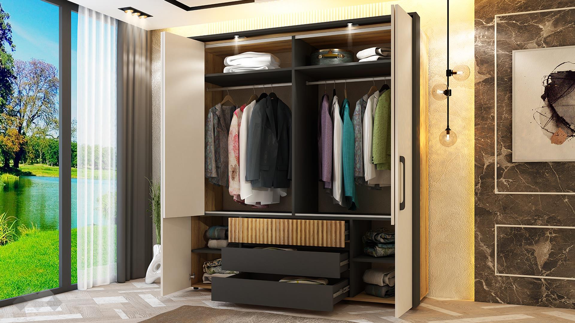 Четирикрилен гардероб, със средна част витрина и три чекмеджета , създава вертикален ритъм и добавя дълбочина към визията на пространството. Вътрешното разпределение е функционално - от ляво разполага с три рафта, по средата зад врата над чекмеджетата има лост за закачалки и LED осветление, а в дясно има два лоста за закачалки на две нива.