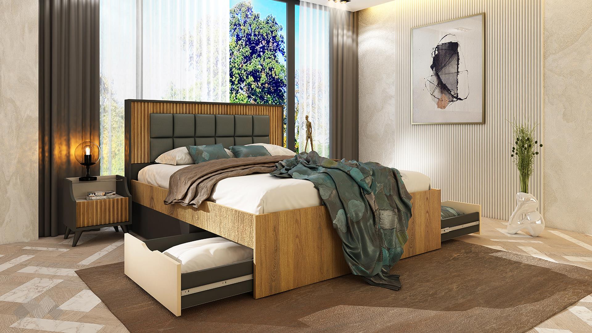 Нощните шкафчета са с минималистичен дизайн – с открит рафт и чекмедже, а изчистения корпус в денвър финиш и графитени акценти следват стилистиката на леглото.