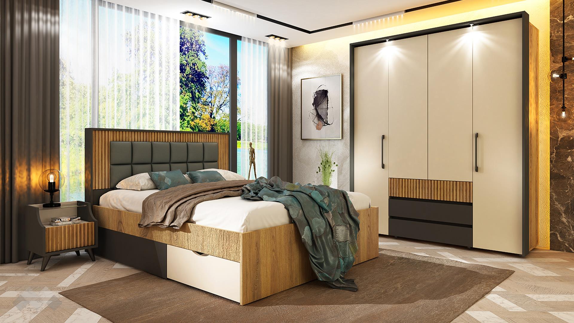 Основен елемент в обзавеждането е спалнята с висока тапицирана табла, подходяща за матрак 160/200. Таблата разполага с LED осветление - служи за нощна лампа и спестява място на плота на нощните шкафчета.Таблата е текстилно облечена в неутрален бежов тон, контрастиращ с рамка в денвърдекор и графитен кант, което допринася за баланса между топлина и модерен характер.