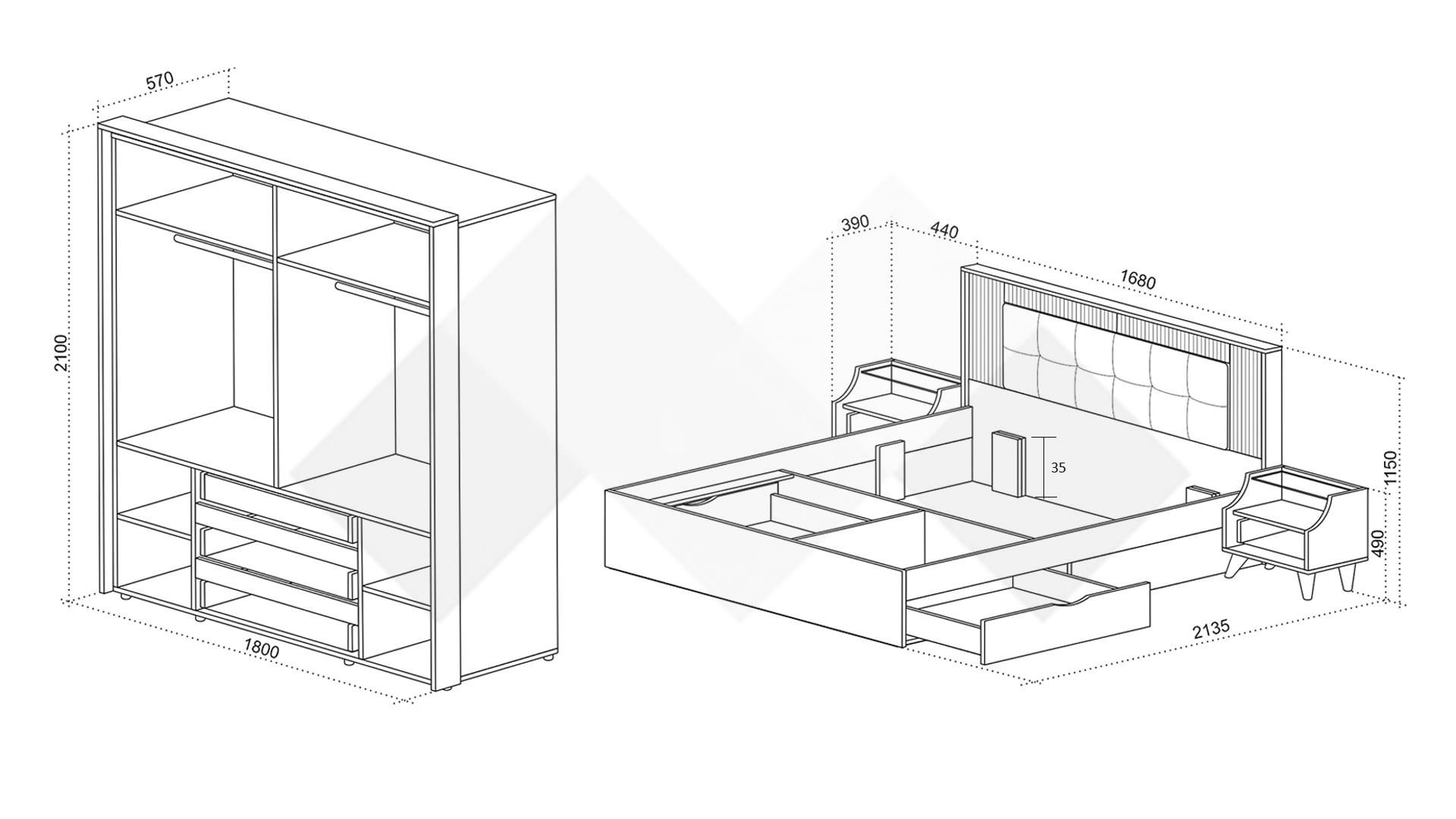 Този изискан спален комплект се отличава с модерна линия, естествени дървесни текстури и внимателно подбрани акценти, които създават уютна, но съвременна атмосфера. Съчетава в себе си функционалност, елегантност и оригинален интериорен почерк.