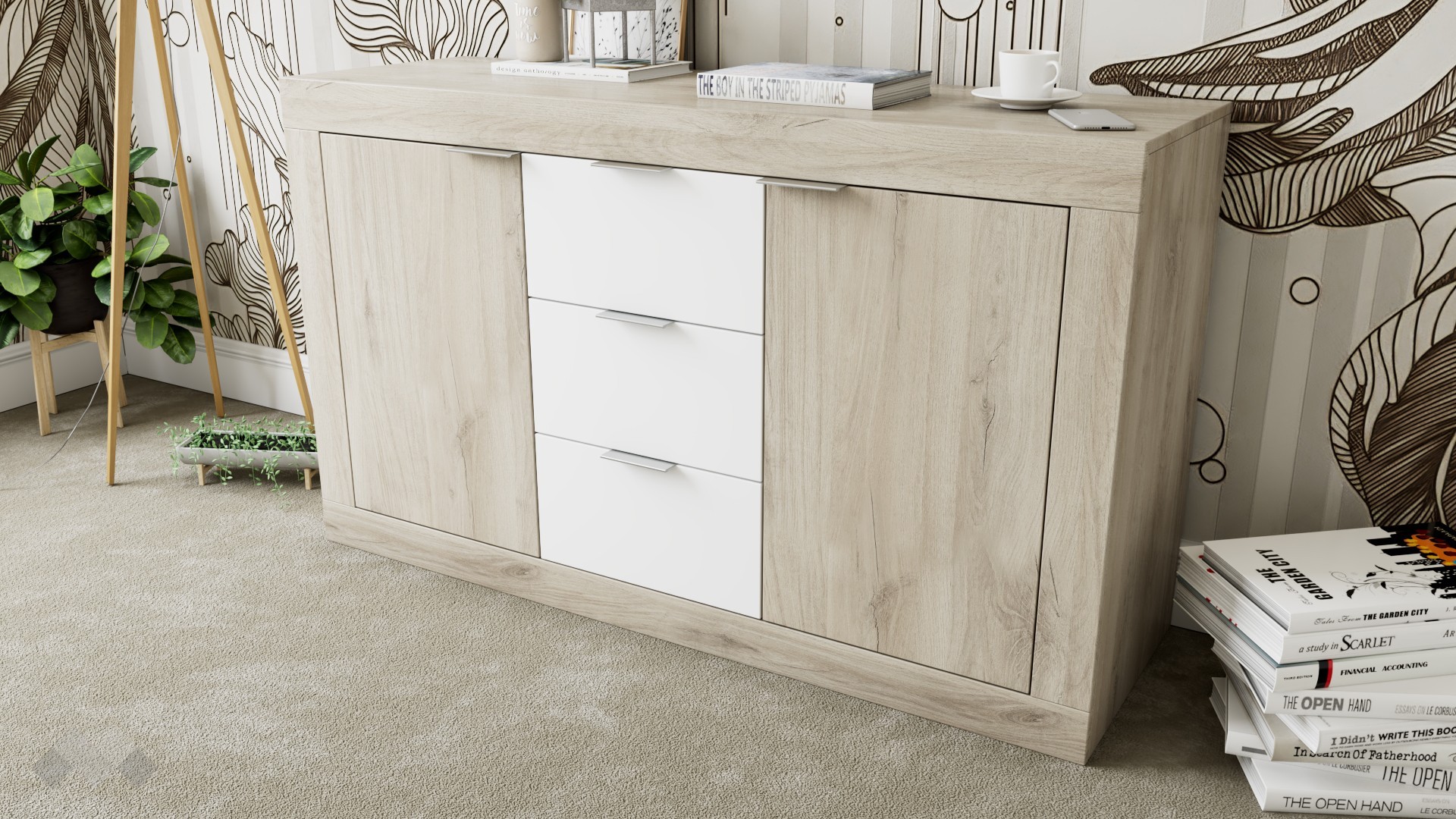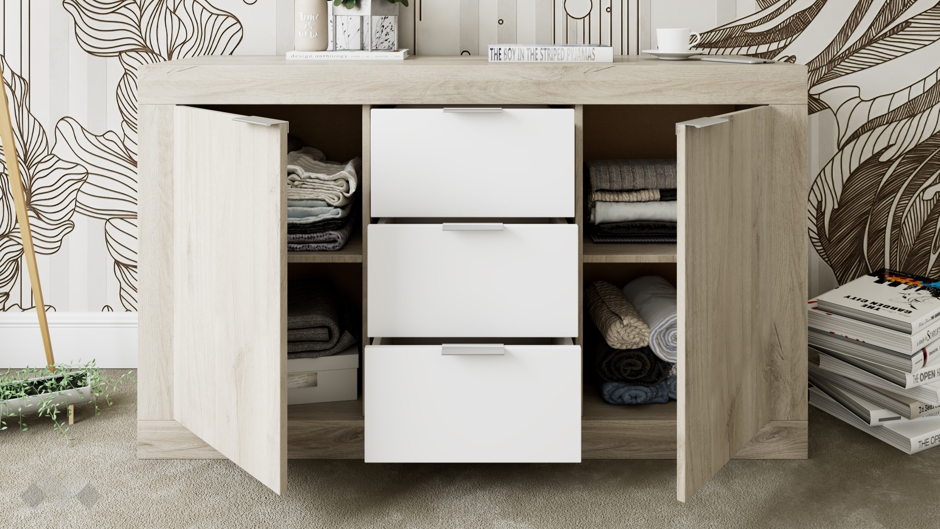 ⭐ Предимства: ✓ 3 чекмеджета ✓ 2 затворени шкафа ✓ компактен и практичен ✓ механизъм за плавно затваряне ✓ модерен декор ✓ качествена изработка ✓ 16 мм ПДЧ