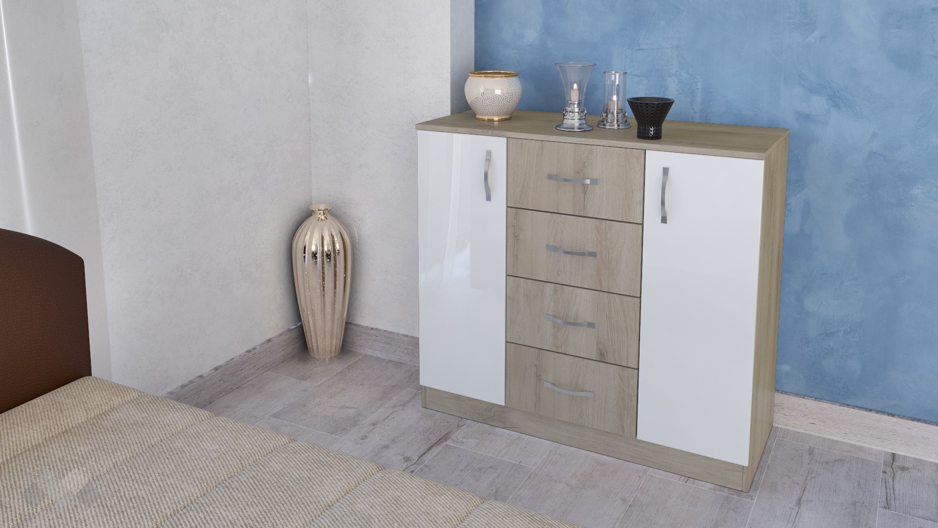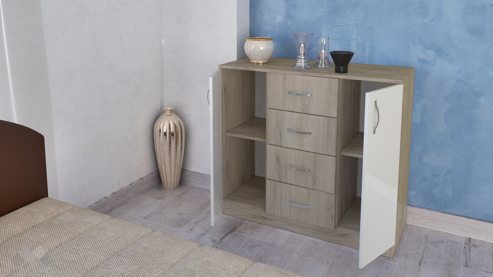 ⭐ Предимства: ✓ 4 чекмеджета ✓ 2 затворени шкафа ✓ компактен и практичен ✓ механизъм за плавно затваряне ✓ модерен декор ✓ качествена изработка ✓ 16 мм ПДЧ