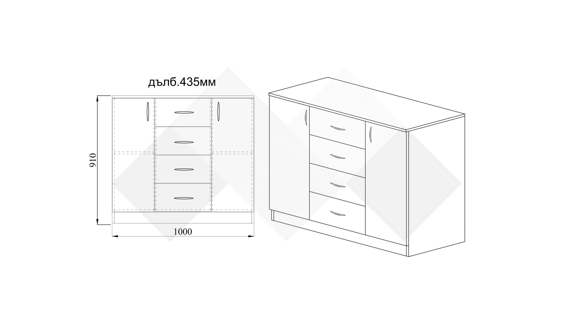 ⭐ Предимства: ✓ 4 чекмеджета ✓ 2 затворени шкафа ✓ компактен и практичен ✓ механизъм за плавно затваряне ✓ модерен декор ✓ качествена изработка ✓ 16 мм ПДЧ