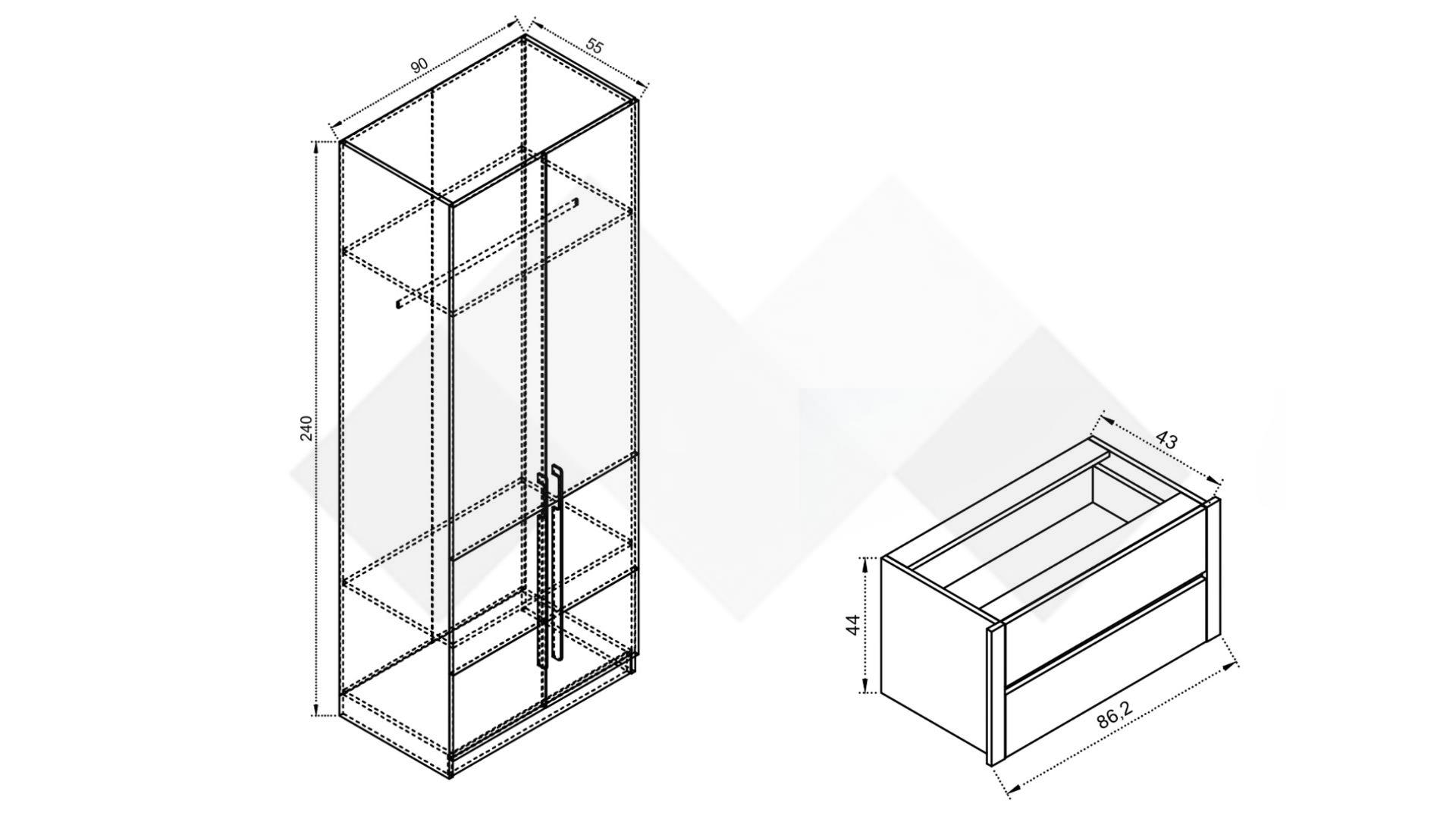 Двукрилен гардероб:  Д: 90 см Ш: 55 см В: 240 см
