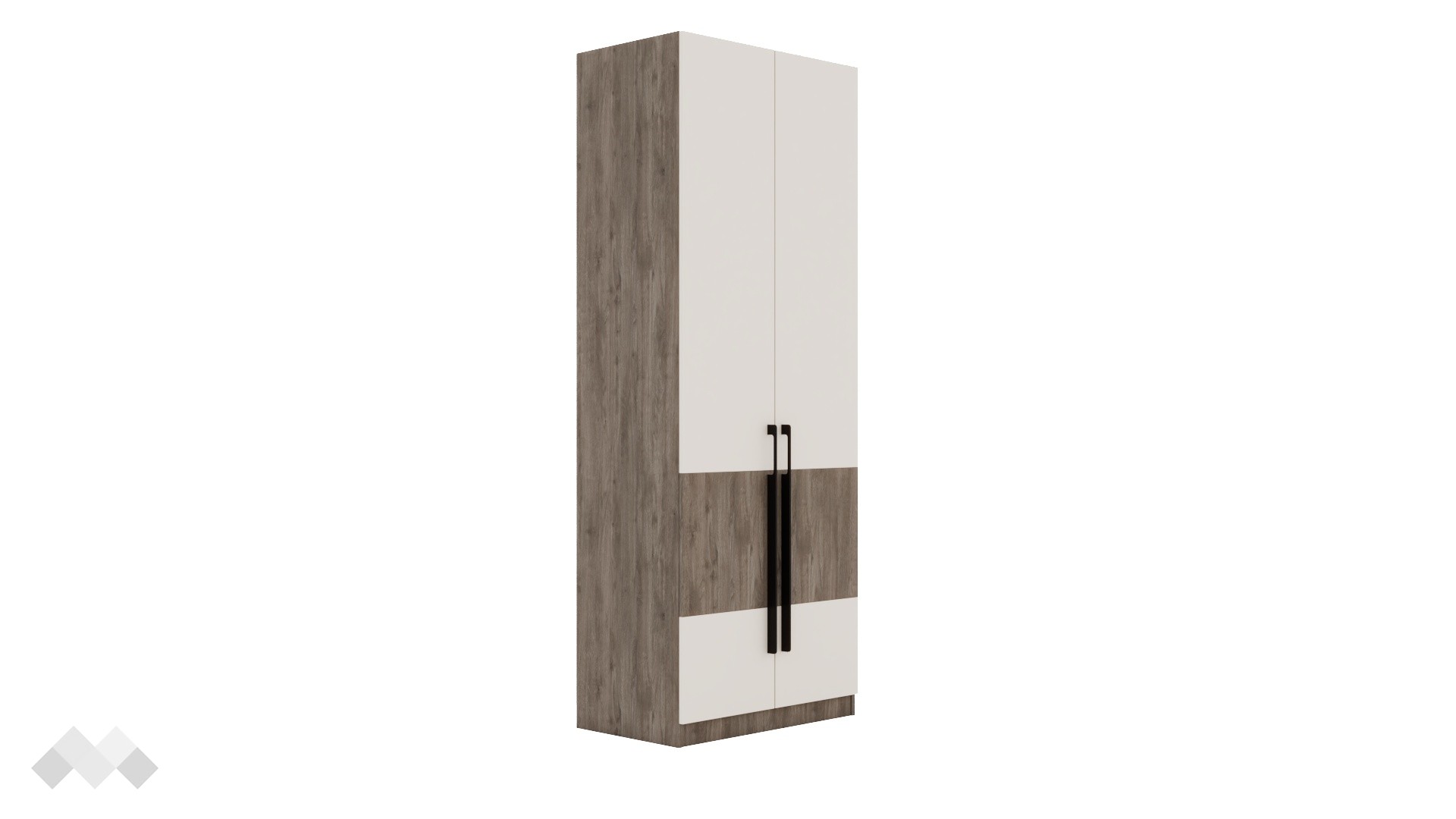 Двукрилният гардероб разполага с два рафта и лост за закачалки, а еднокрилният скосен гардероб е с четири рафта, което ще ти позволи да подредиш добре всичките си дрехи и аксесоари. А любимите си книги, скъпи спомени като сувенири и фотографии, декорации или вещи, които искаш да ти бъдат винаги под ръка, можеш да подредиш върху петте открити рафта на високия шкаф етажерка.