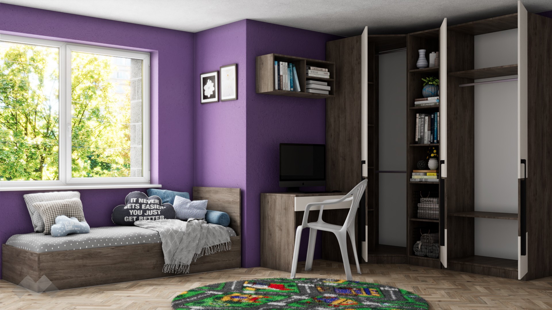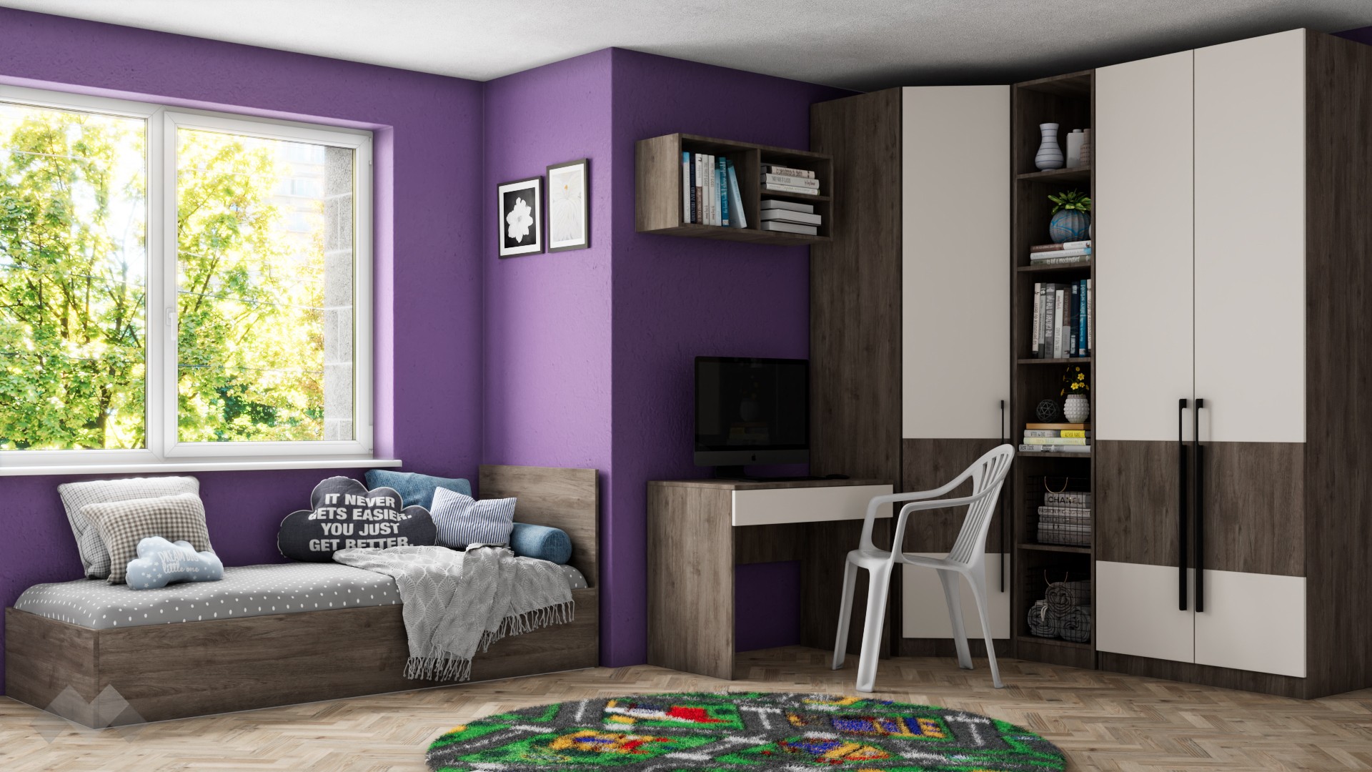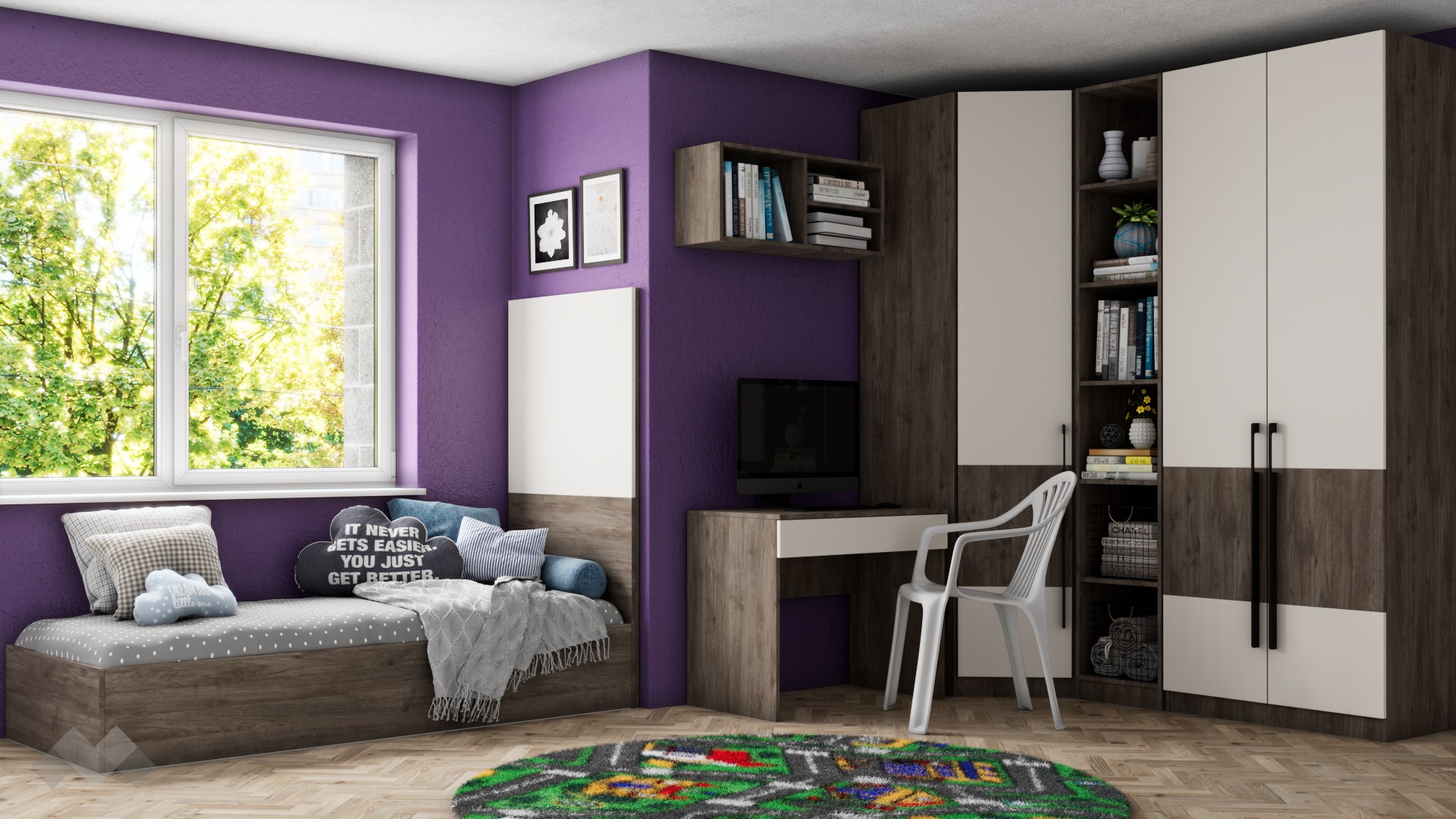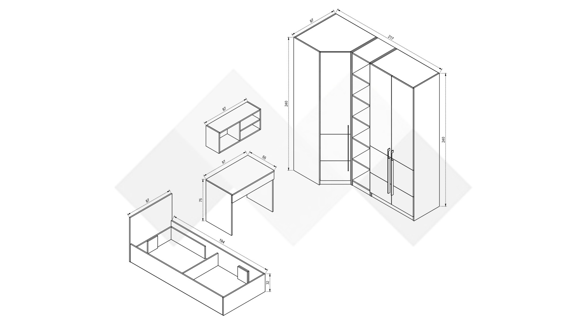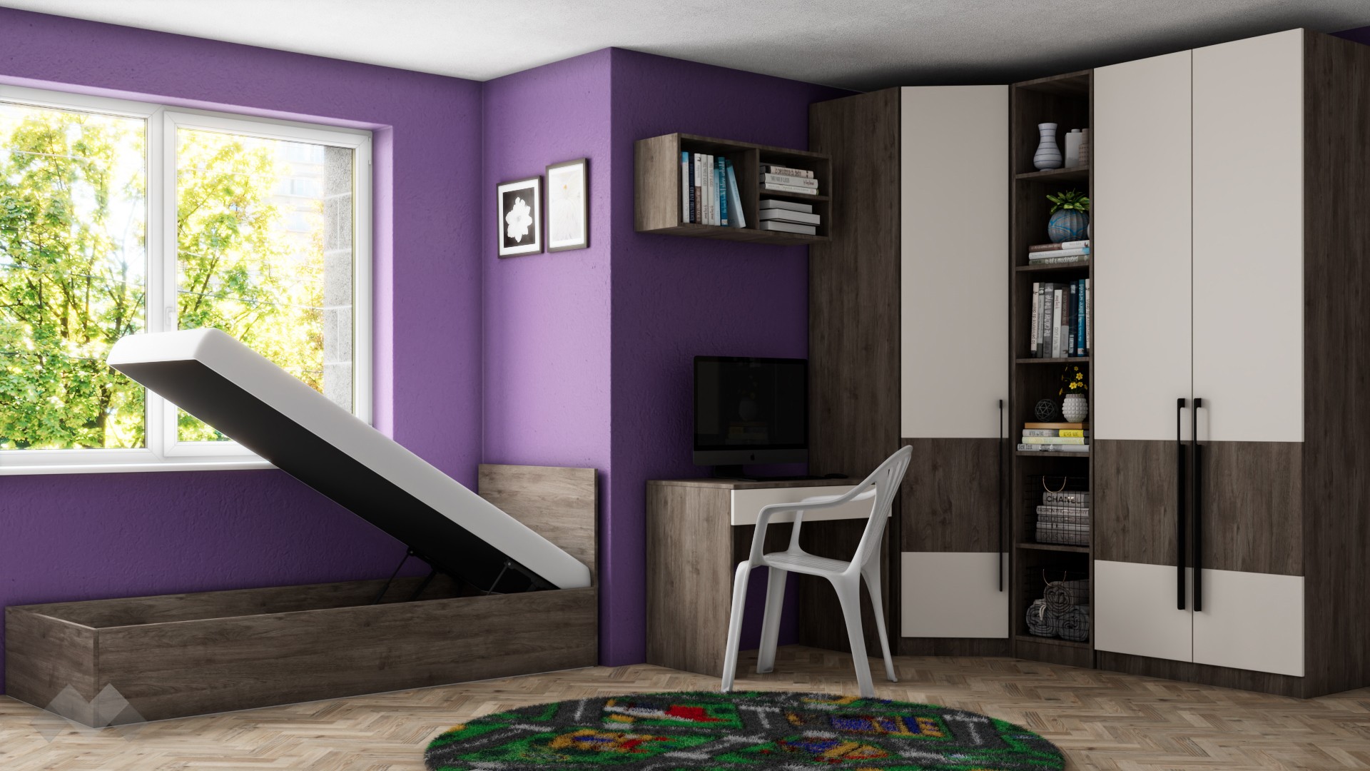 Ъгловият гардероб е снабден с четири рафта и два лоста за закачалки , а двукрилният гардероб разполага с два рафта и лост за закачалки,  което ще ти позволи да подредиш добре всичките си дрехи и аксесоари. Любимите си книги, скъпи спомени като сувенири и фотографии,  които искаш да ти бъдат винаги под ръка, можеш да подредиш върху петте открити рафта на високия шкаф етажерка.