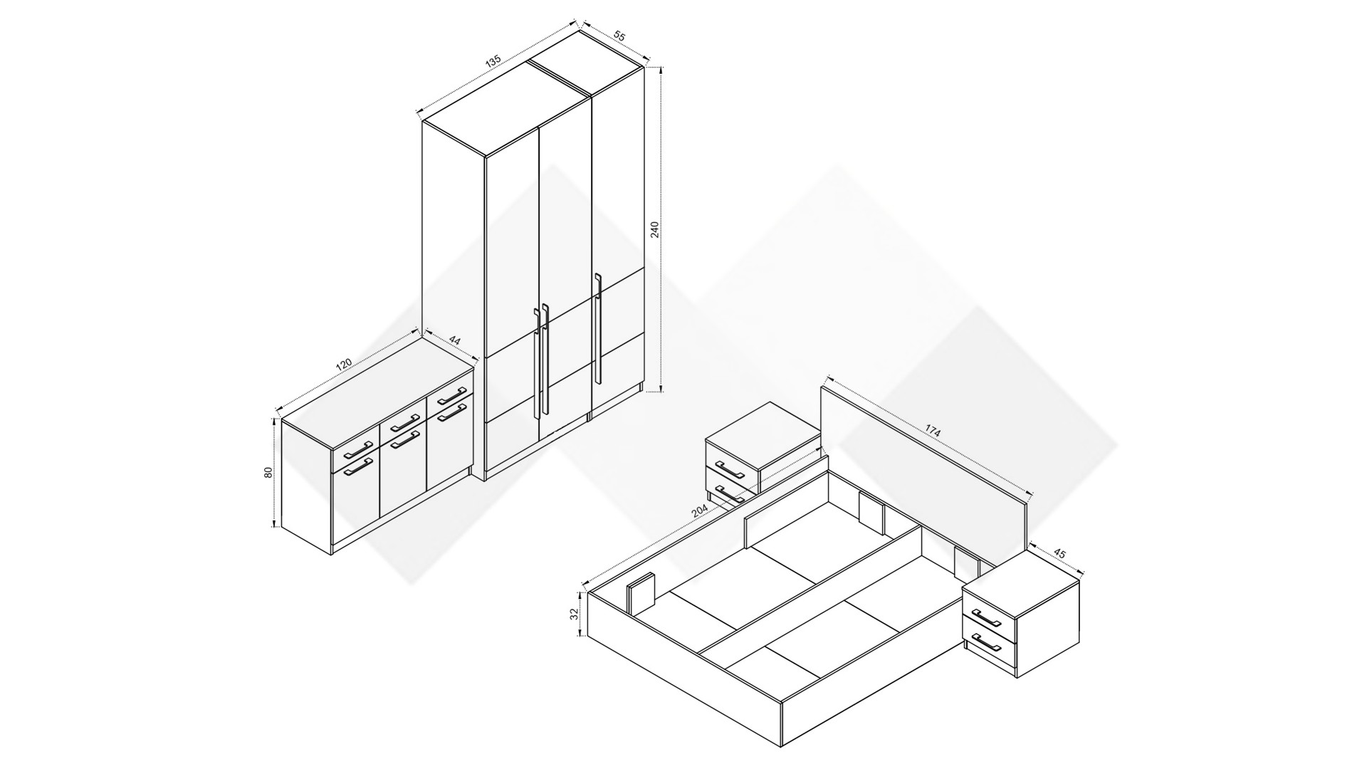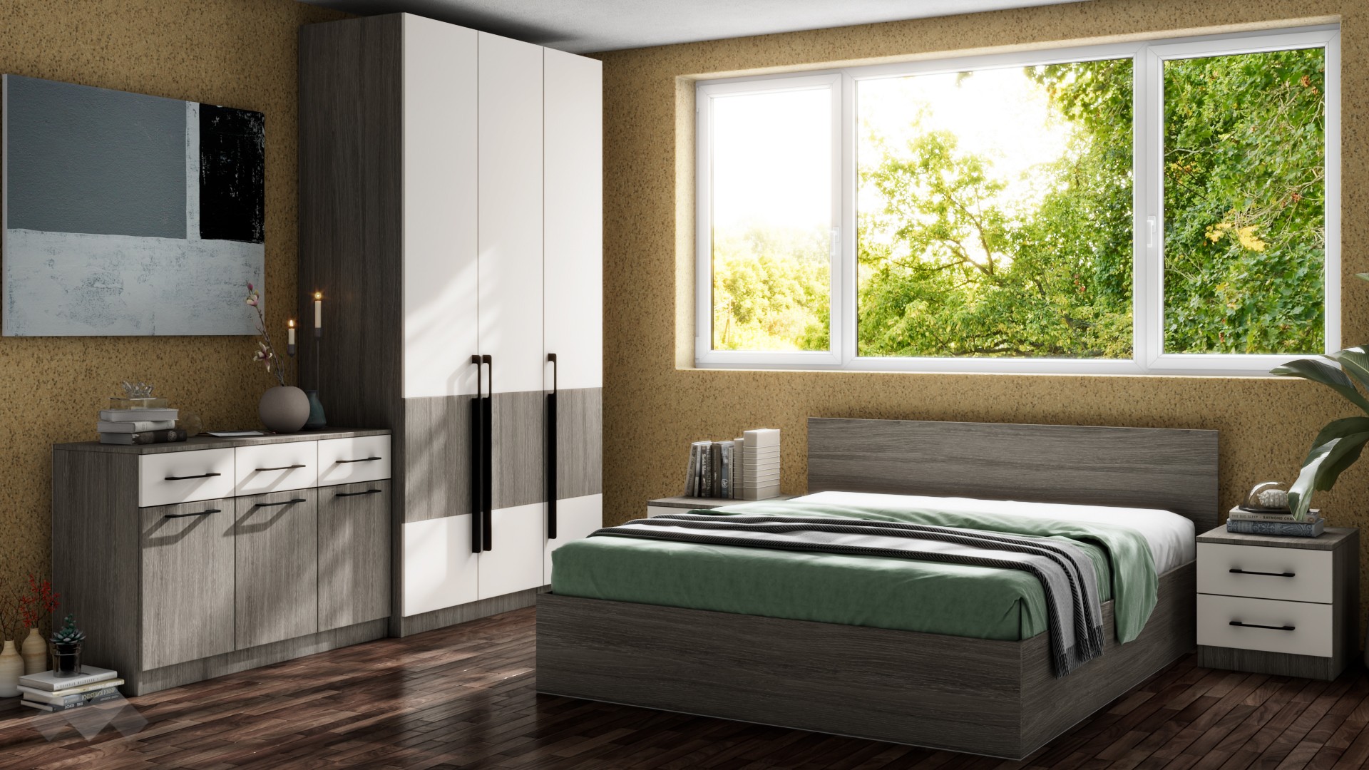 ⭐ Предимства: ✓ 18 мм ПДЧ ✓ спалня за матрак 160/200 ✓повдигащ механизъм ✓ гардеробна система ✓ механизъм за плавно затваряне ✓ скрин с 3 чекмеджета и 3 врати ✓ две нощни шкафчета ✓ модерен и функционален дизайн