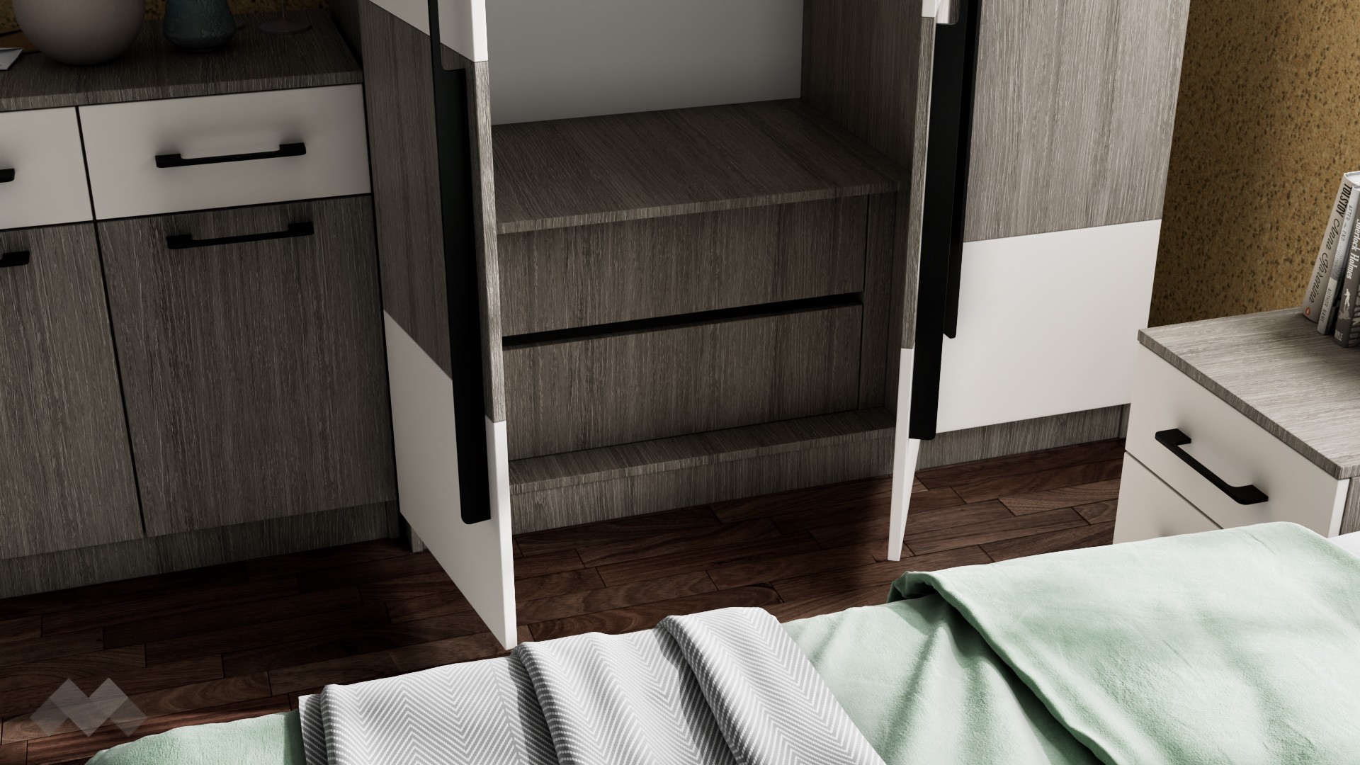 Двукрилният гардероб разполага с два рафта и лост за закачалки, а еднокрилния гардероб с четири рафта, осигурявайки ти достатъчно място за организиране и съхранение на дрехи, аксесоари и други лични вещи.