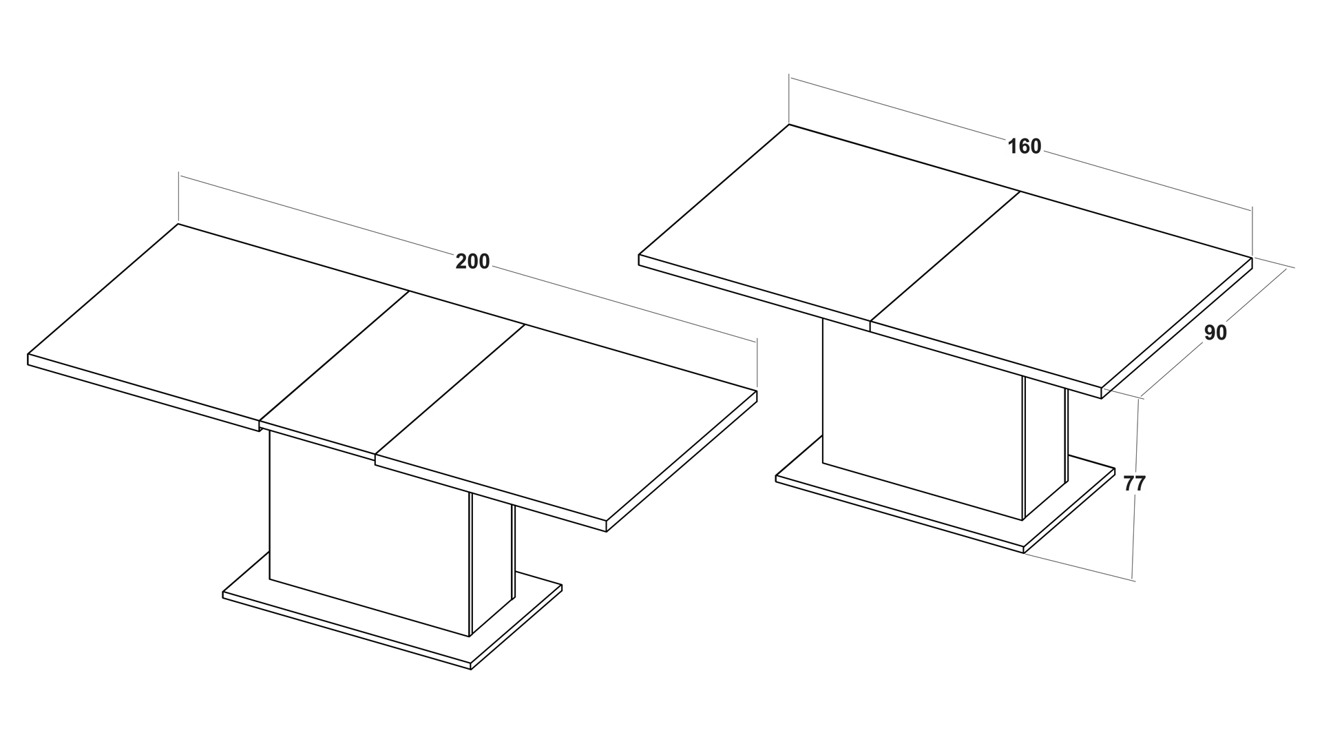 Моделът е снабден с разтегателен механизъм, който увеличава дължината на плота от 160 до 200 см, осигурявайки повече място за семейни събирания или гости. Формата и размерите ѝ позволяват комфортно настаняване и лесна подредба на масата.