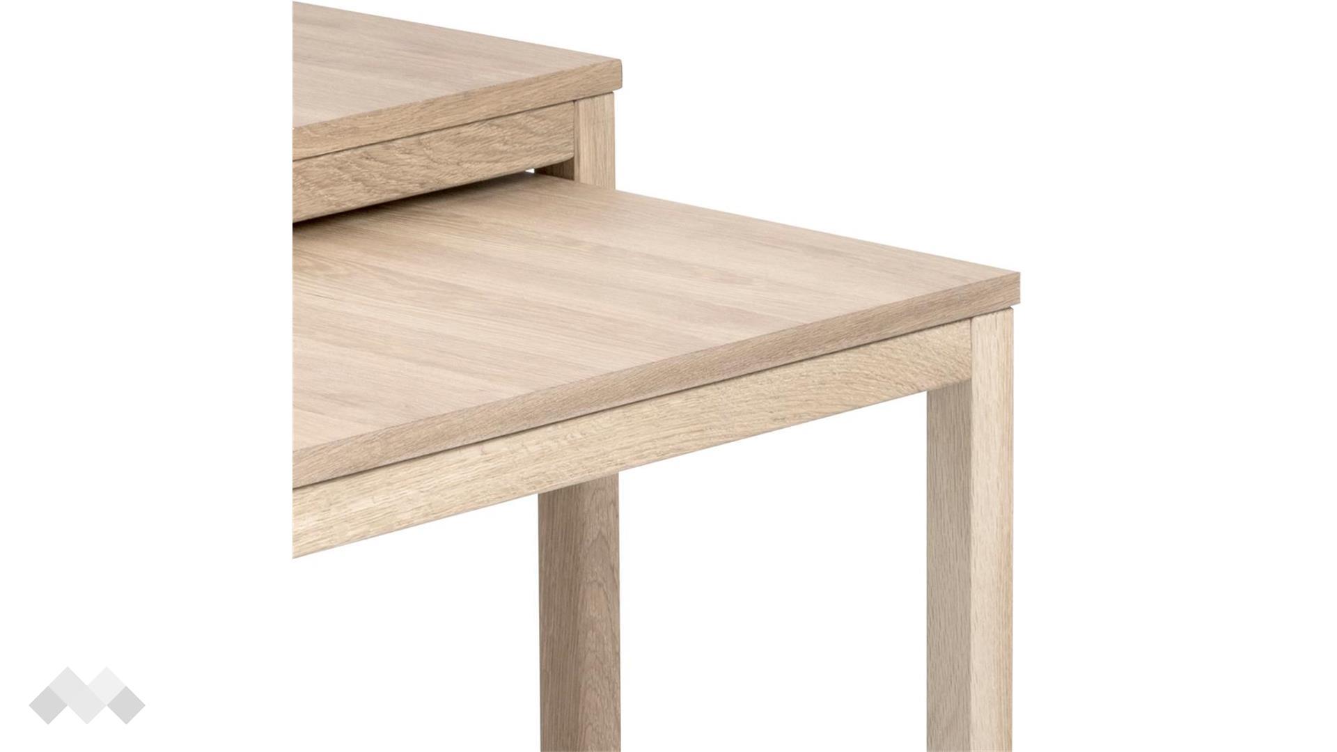 Плотът от ПДЧ е здрав и устойчив на ежедневна употреба, докато основата от масивна дървесина осигурява допълнителна издръжливост и класическа визия. Повърхността на масите е лесна за поддръжка и придава усещане за солидност и качество, което ги прави идеален избор за трайна употреба. Комплектът може да се използва заедно или поотделно, в зависимост от нуждите и пространството.