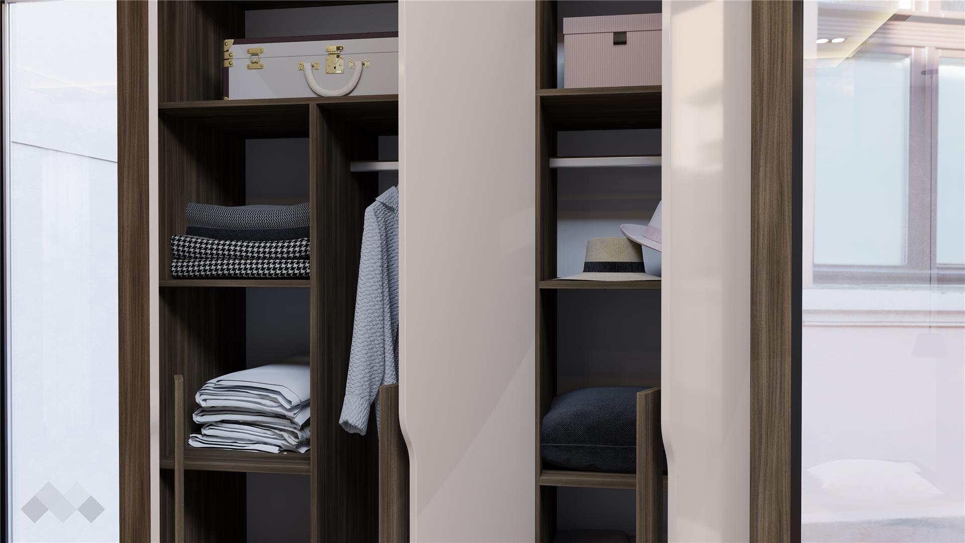 Трикрилният гардероб впечатлява с височина 220 см и предлага добре организирано вътрешно пространство за съхранение. Със своята дълбочина, рафтове и лост за закачалки, той позволява подредено и удобно прибиране на дрехи и аксесоари.