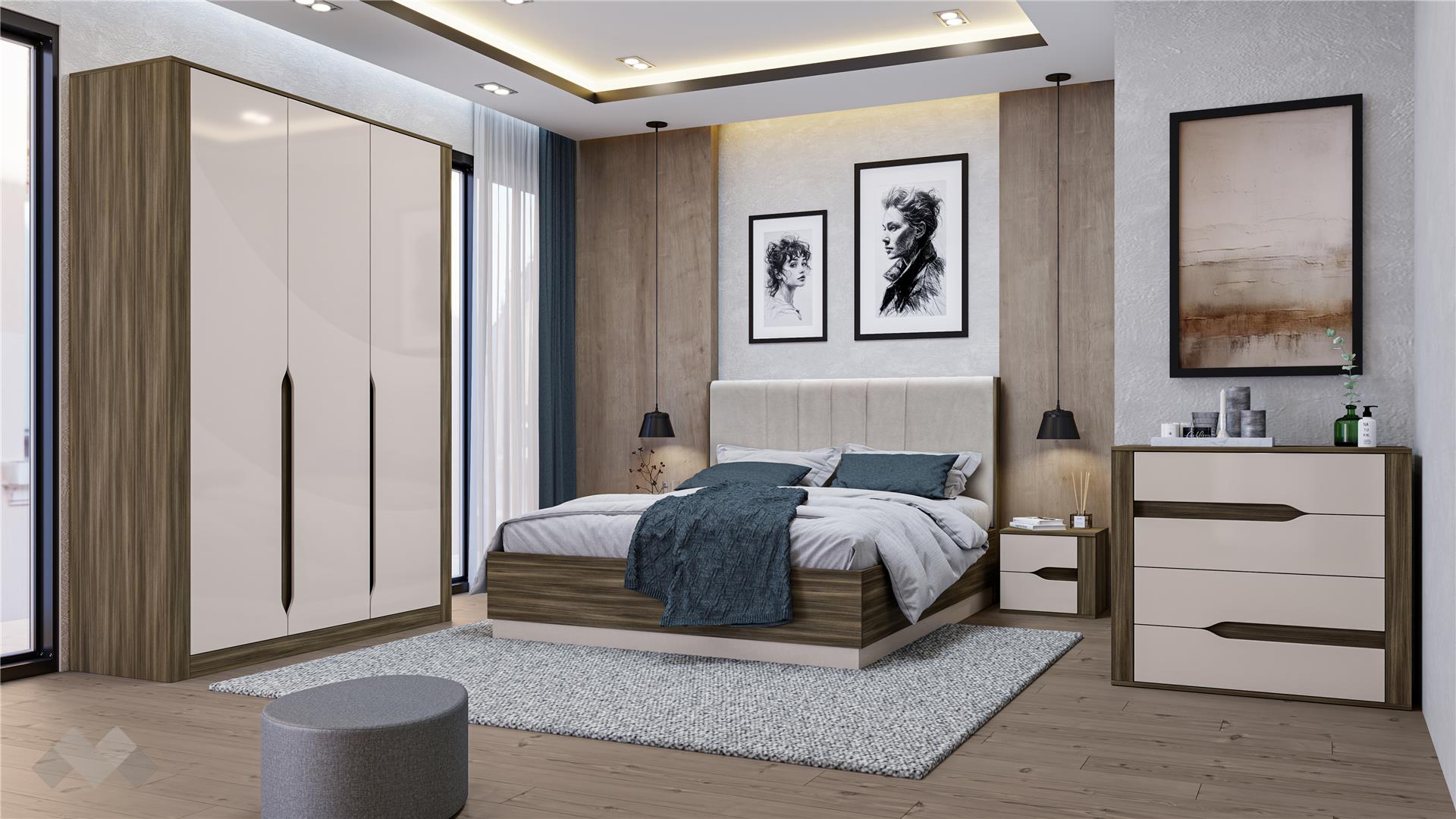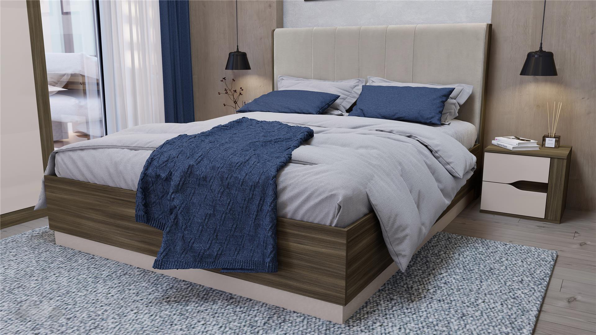 Спалнята е подходяща за матрак с размери 160/200 см и осигурява комфортна височина за сядане и почивка. Стилната тапицирана табла допринася за завършен и елегантен облик, като същевременно осигурява удобство при четене или отмора.