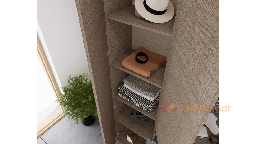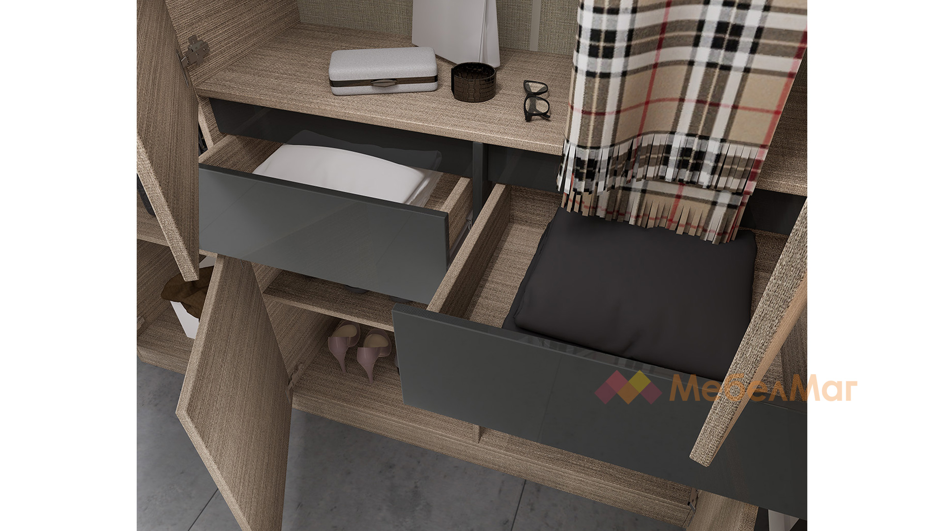 Моделът разполага с висок шкаф с огледала на вратата за да си сигурен, че изглеждаш перфектно имаш и огледало, на което можеш да хвърлиш последен поглед на външния си вид преди да излезеш. На петте рафта скрити зад нея имаш достатъчно място за съхранение на своите вещи.
