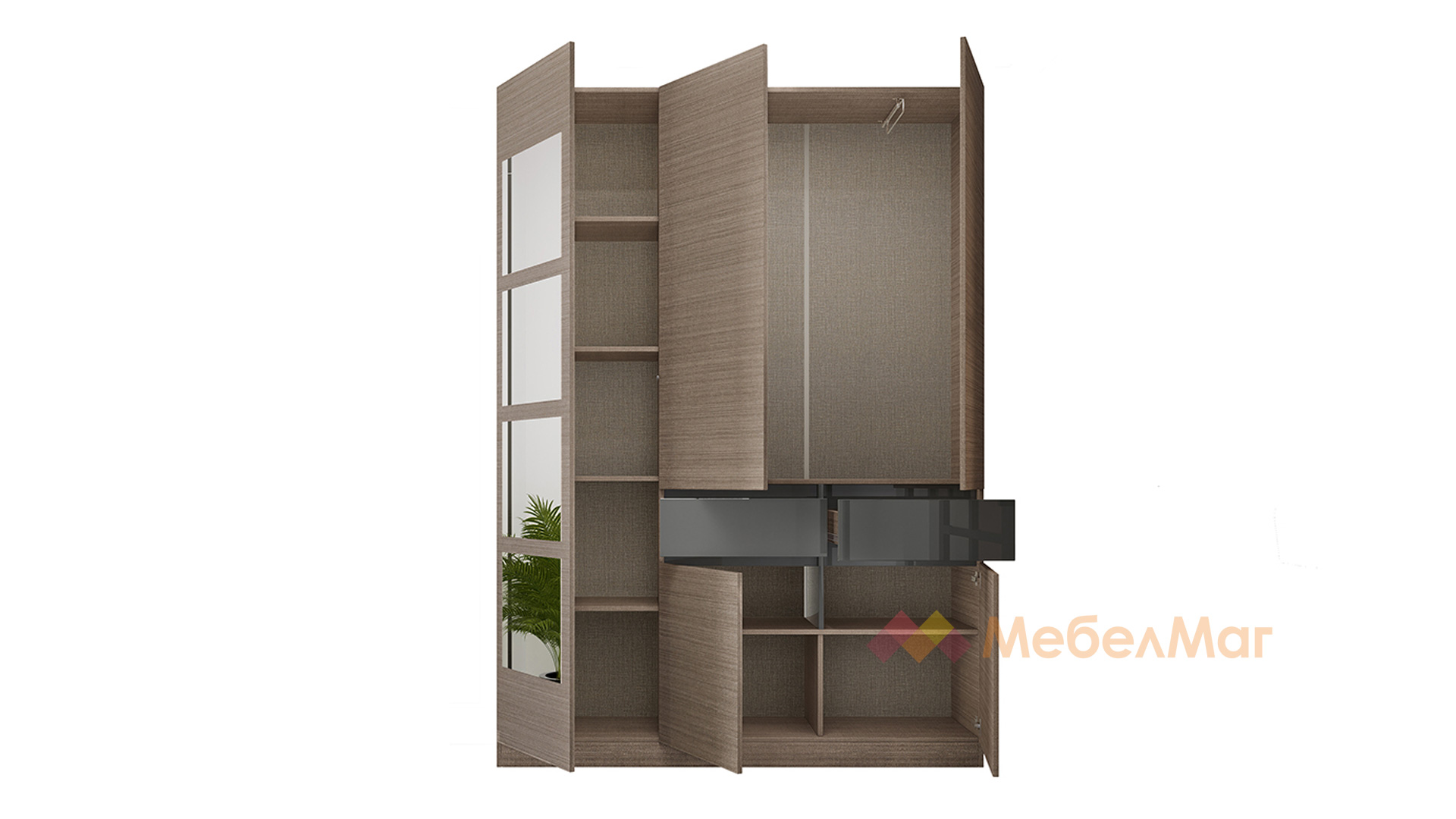 ✓ 4 огледала ✓ 5 рафта ✓ шкаф за обувки на две нива ✓изтеглящ се лост за закачалки ✓ 2 чекмеджета ✓ механизъм за плавно затваряне ✓ с монтаж към стената ✓ модерен декор ✓ качествена изработка ✓ 16 мм ПДЧ