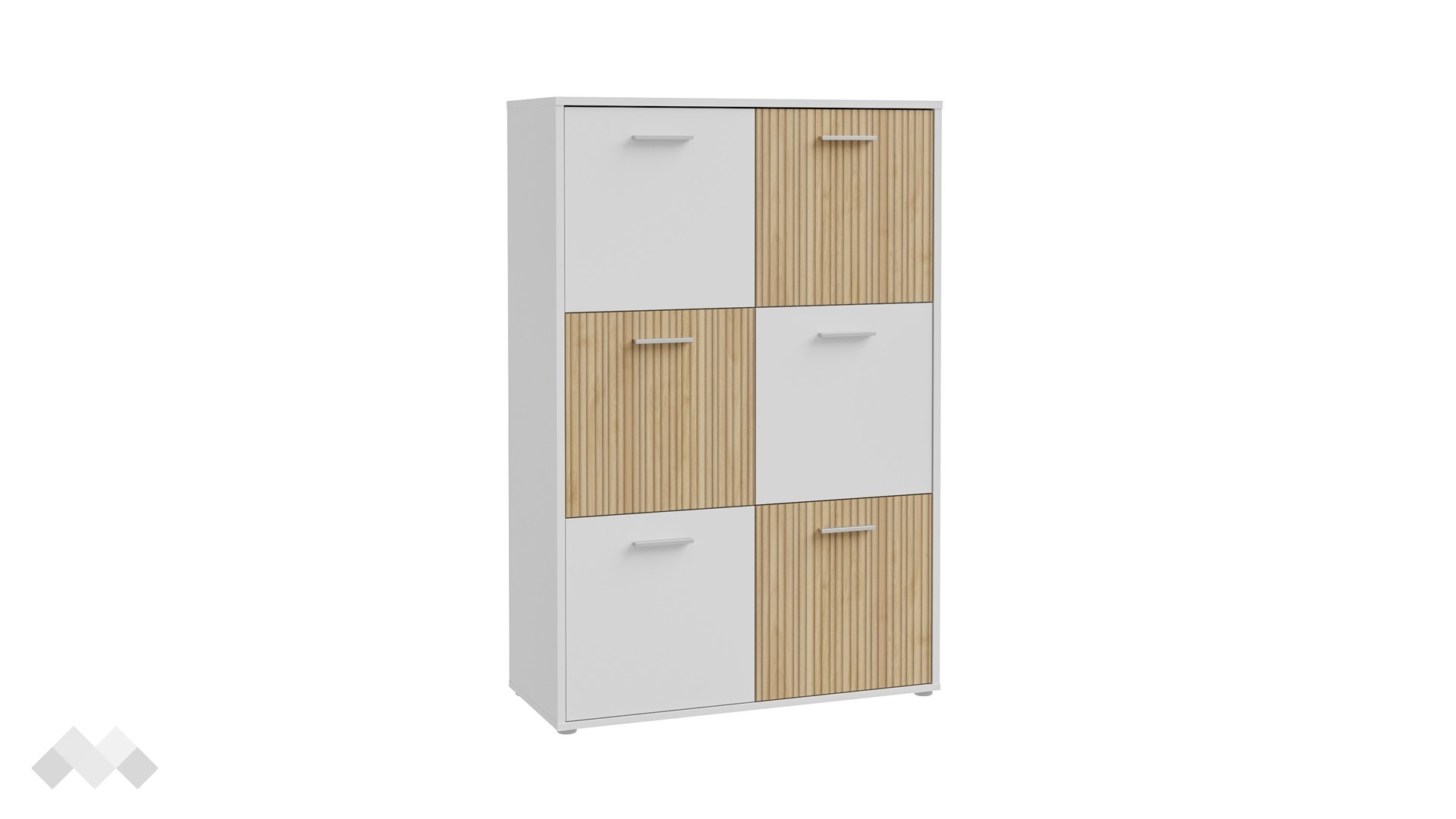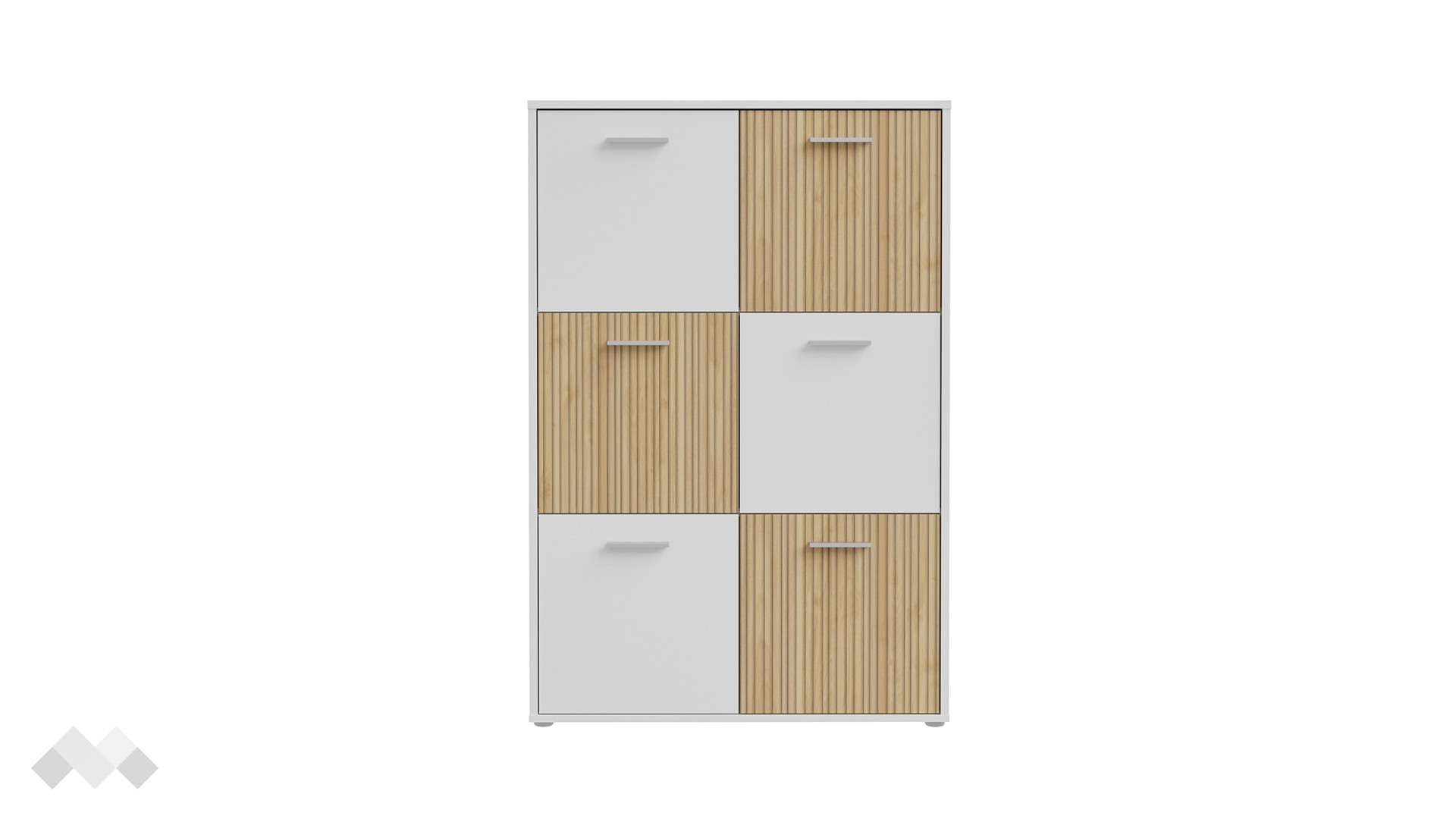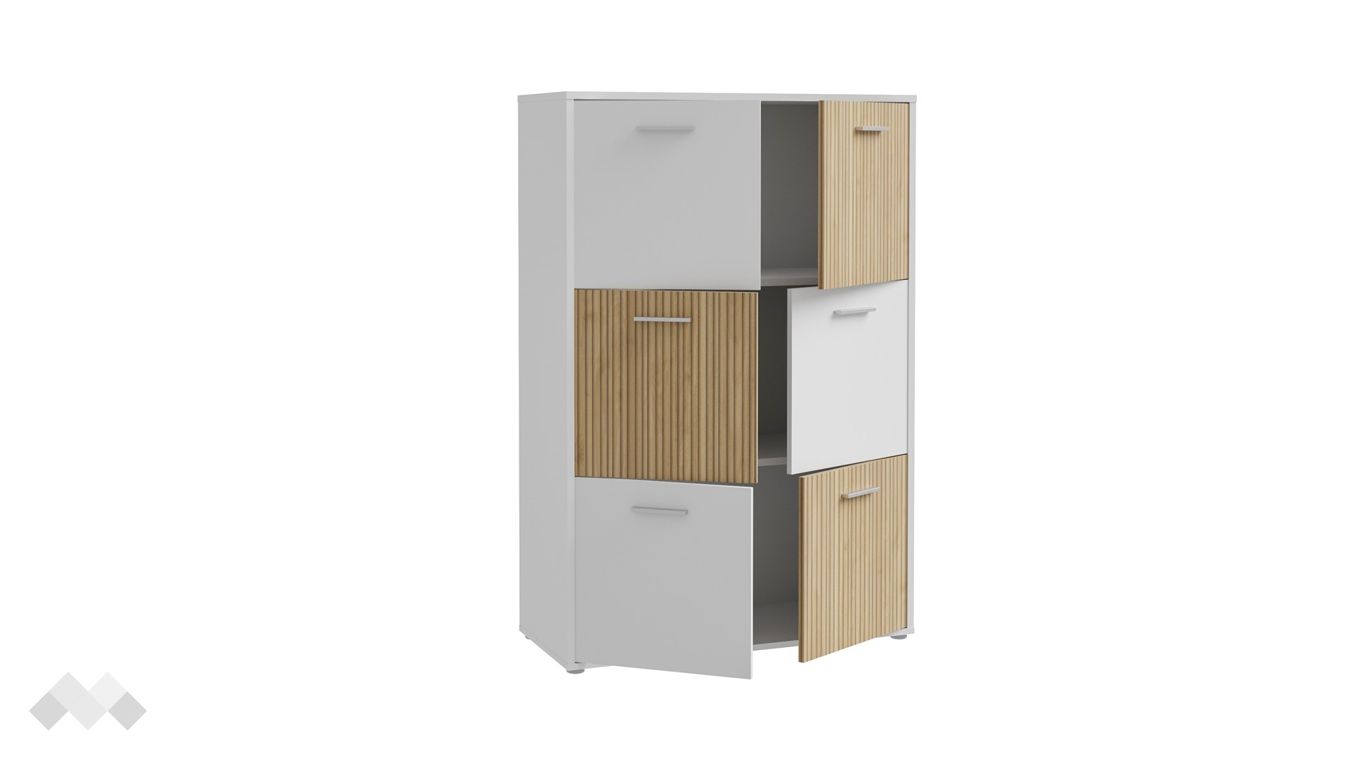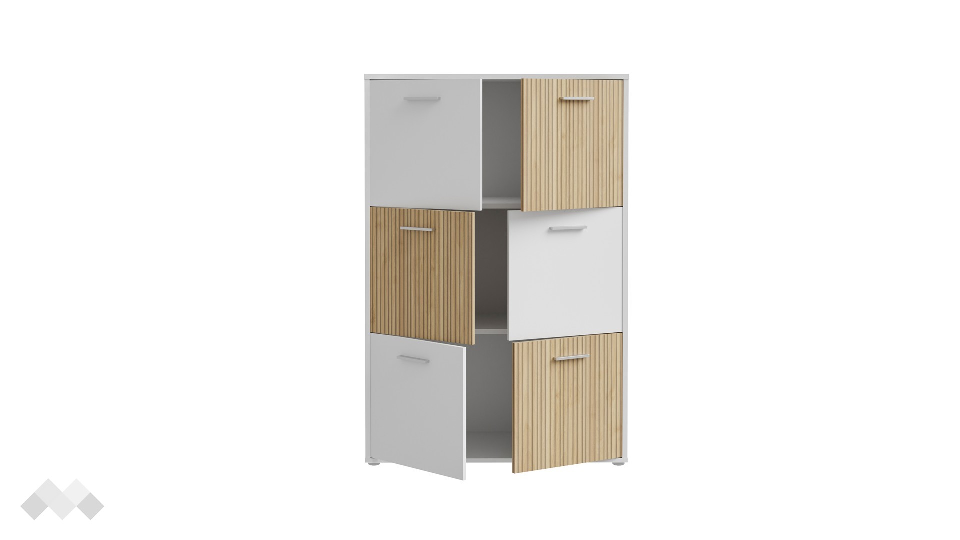 Шкафът предлага удобно разпределение с шест врати, които разкриват обширни отделения, подходящи за дрехи, аксесоари или домакински принадлежности.