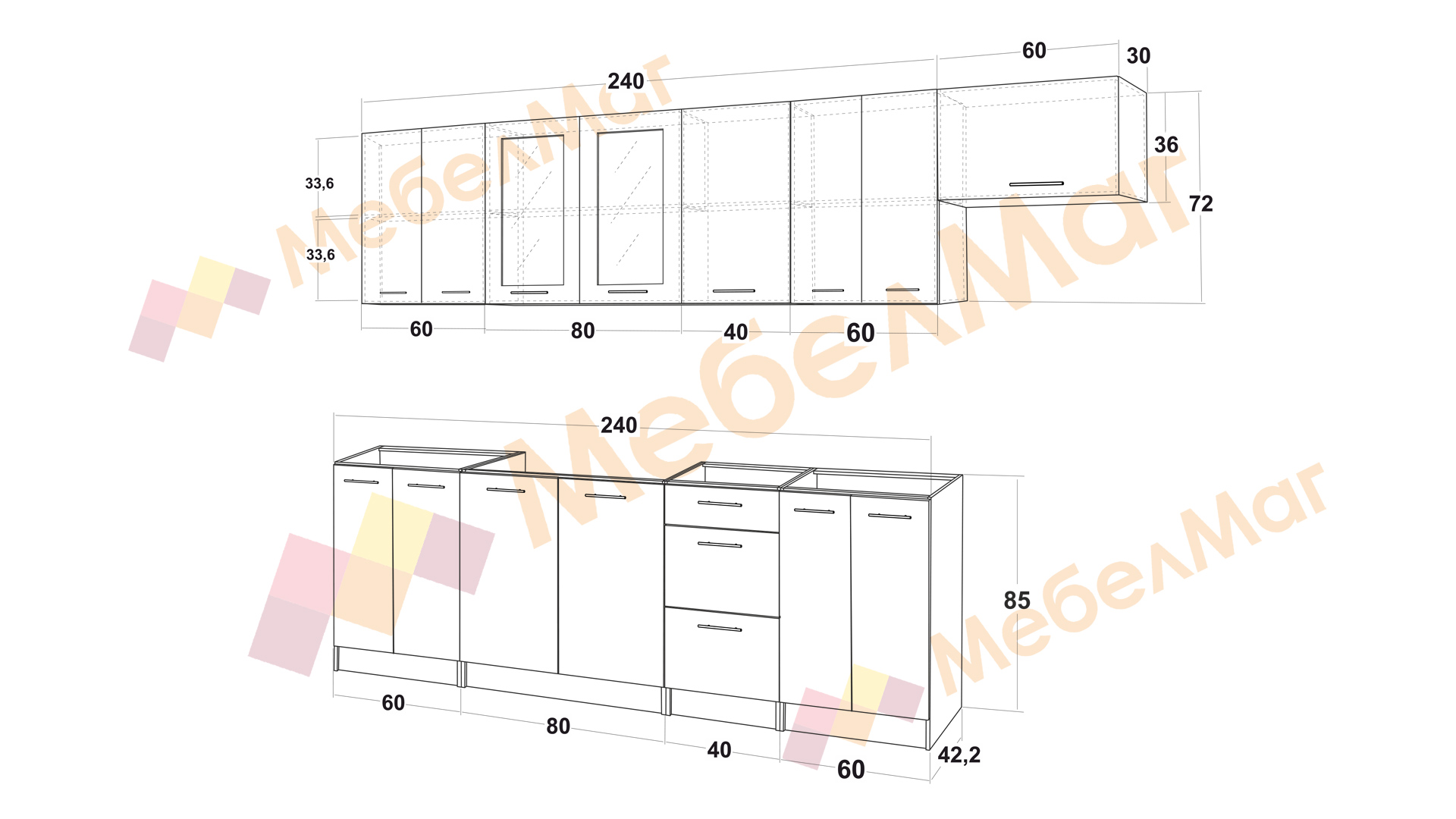 Долен модул: Д: 240 см. Ш: 42,2 см. В: 85см.