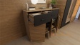 Сърцето на комплекта е елегантната спалня, създадена за удобство и стил. Тапицираната табла добавя мекота и лукс с черната си кожа и контрастния кафяв шев, докато голямото чекмедже и отворените рафтове от двете страни на леглото осигуряват допълнително място за съхранение на книги, аксесоари или спално бельо. Леглото е с високи лубове, които осигуряват удобна височина за сядане – 51-53 см с матрака.