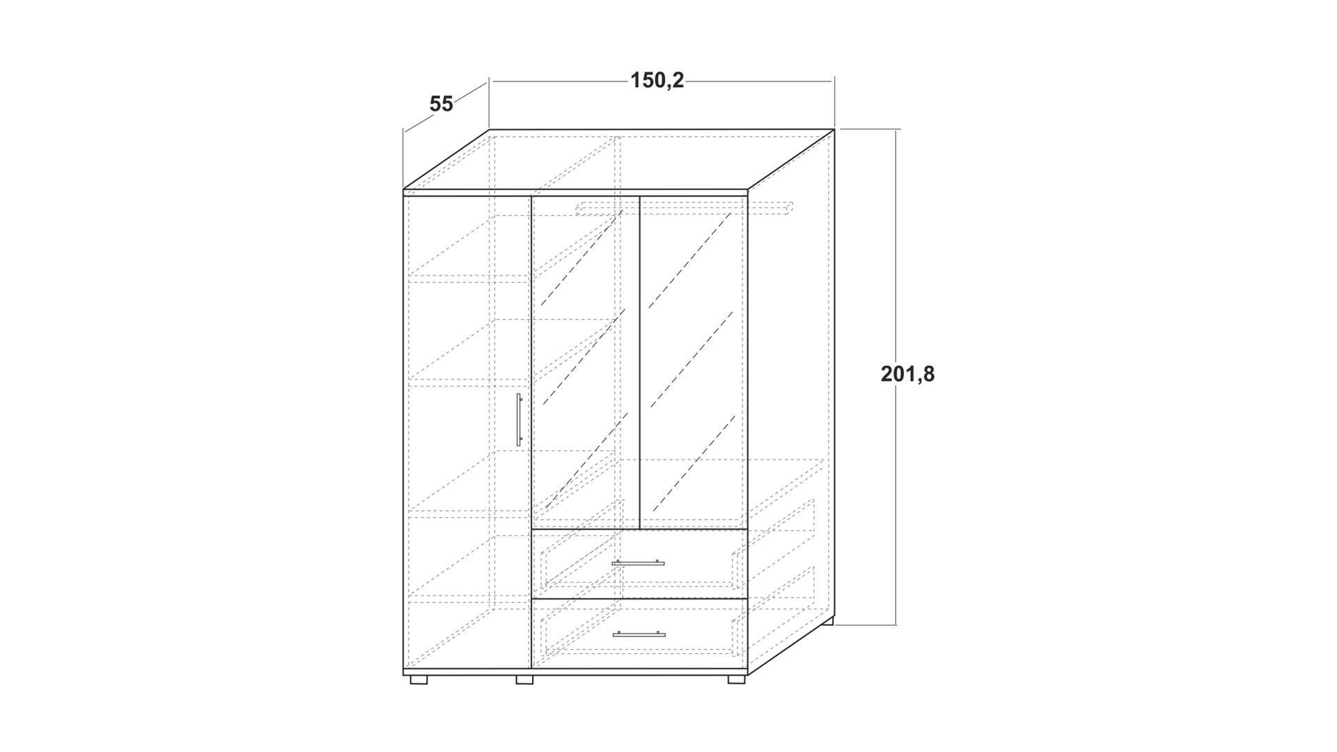 Д: 150,2 см Ш: 55 см В: 201,8 см