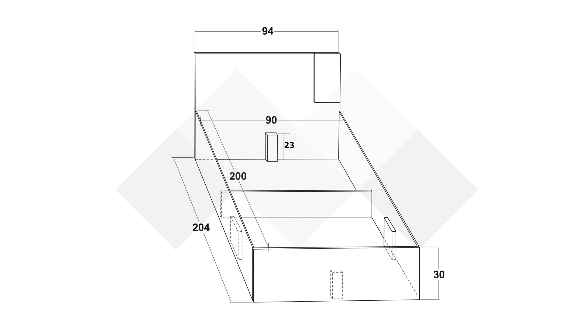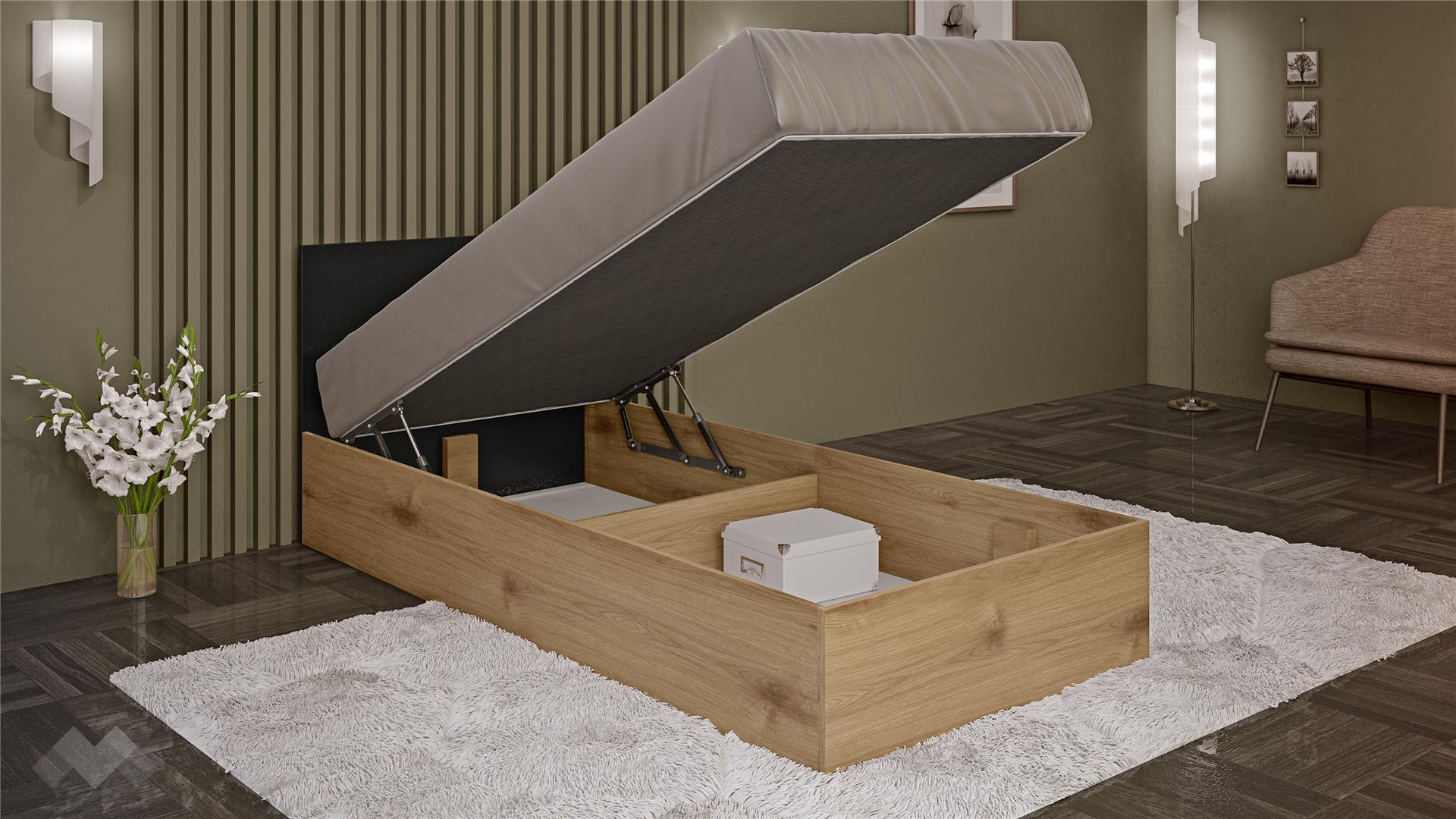 Леглото е с изчистени линии и стабилна основа, подходящо за матрак с размери 90/200 см. Включеният механизъм предлага удобно място за съхранение на завивки и възглавници, сезонни дрехи.
