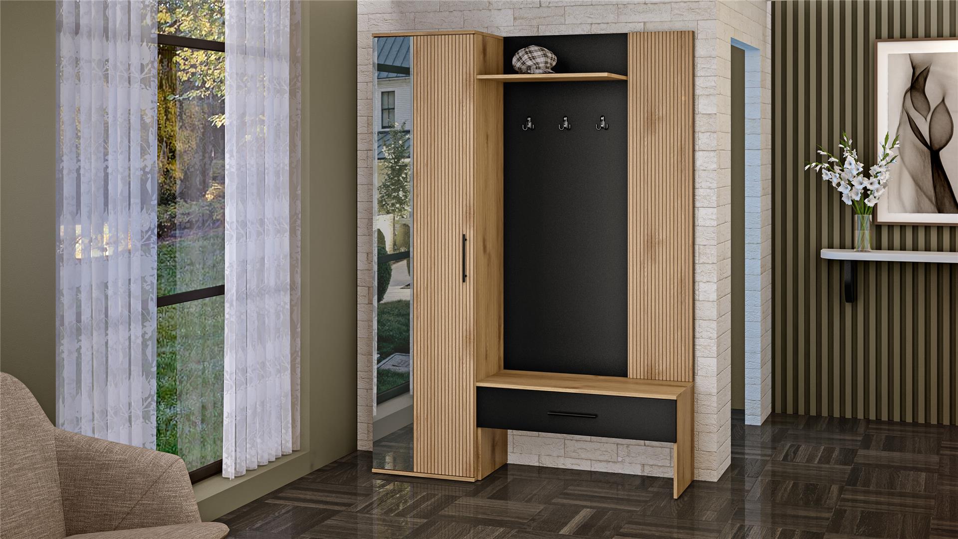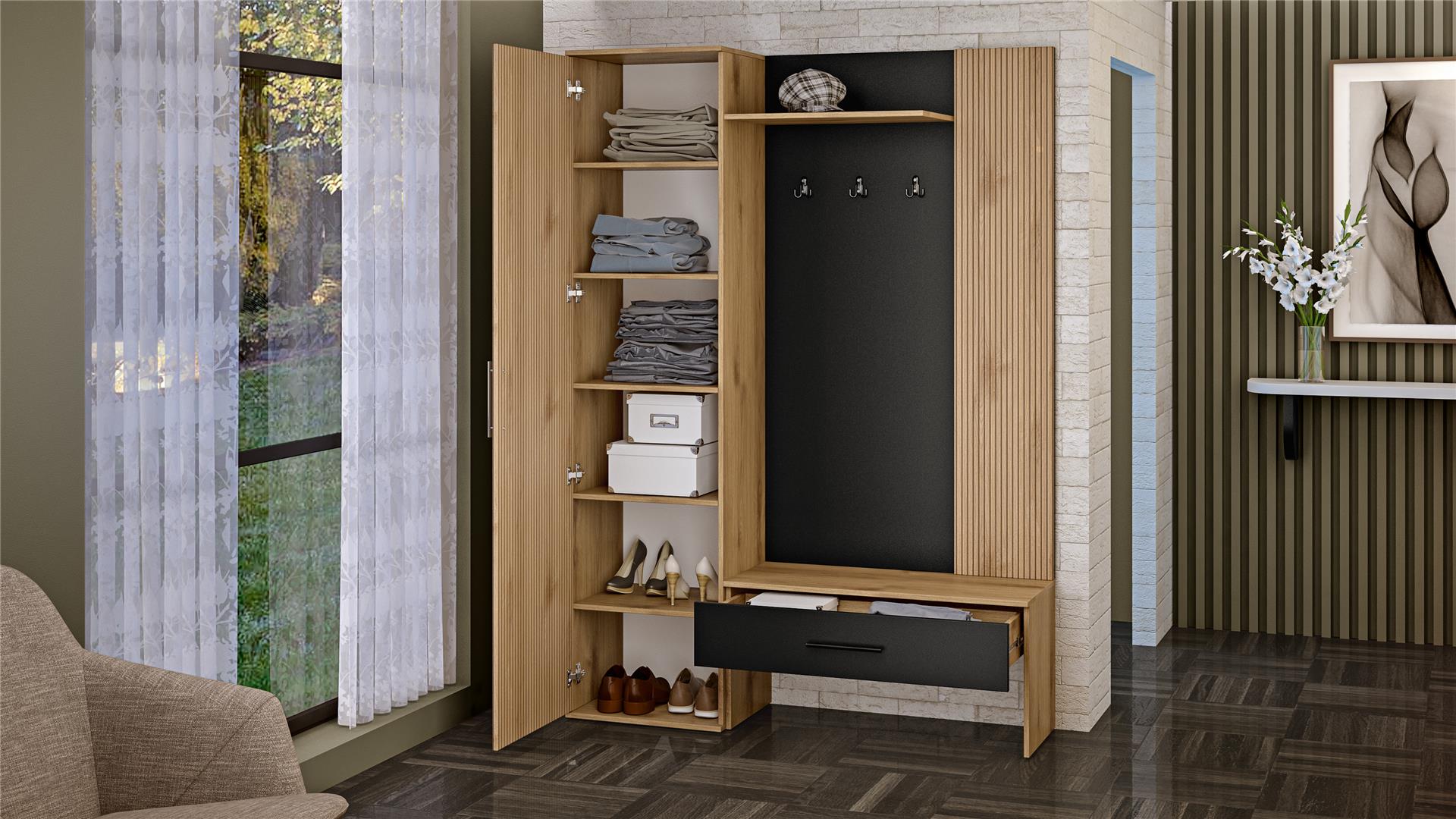 Разполага с 5 рафта за дрехи, чанти или аксесоари и удобно чекмедже с плавно затваряне за дребни вещи, както и отворена зона с 3 закачалки за връхни дрехи. Горният рафт в отворената част е идеален за шапки, кутии или декорация.