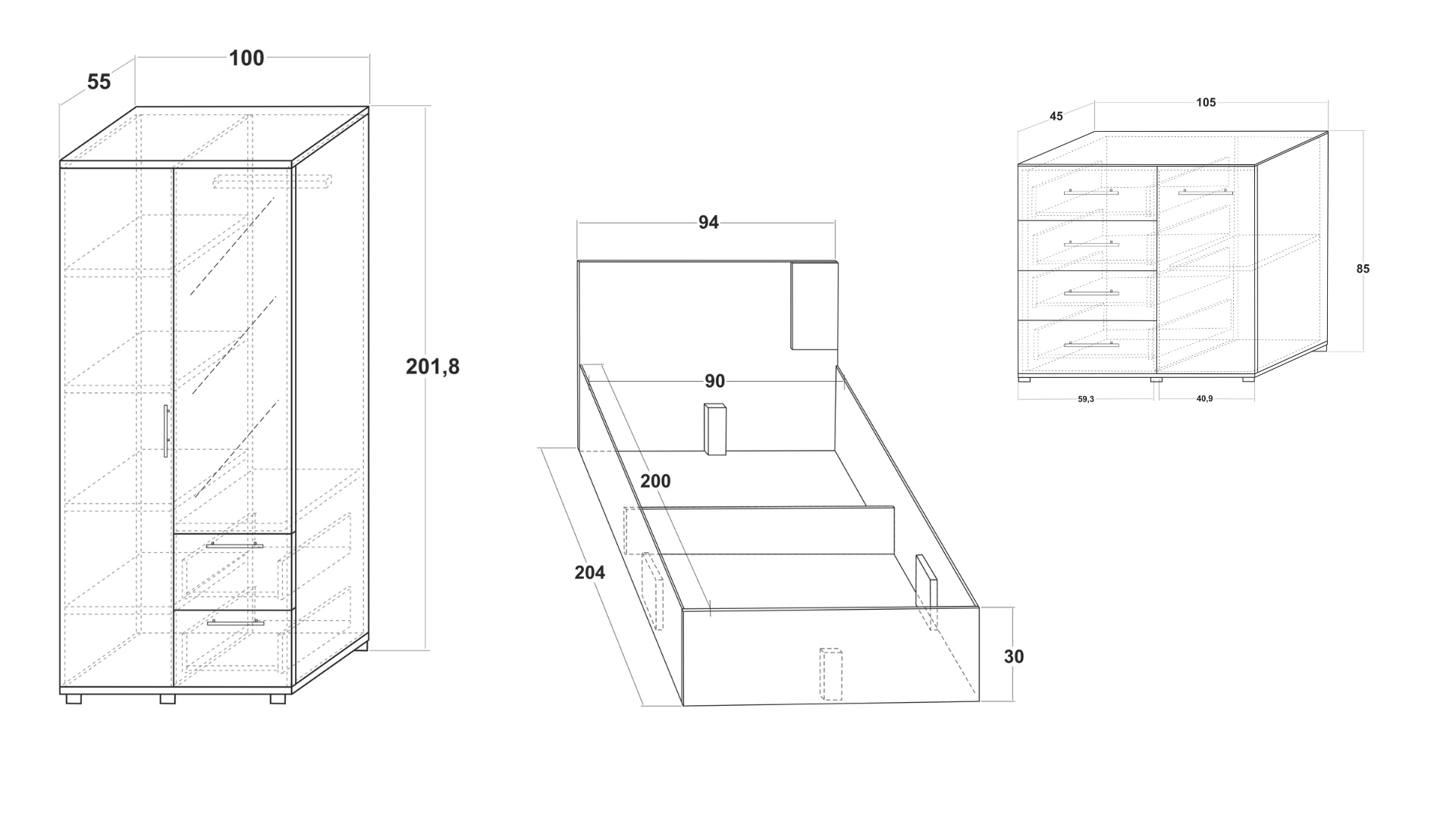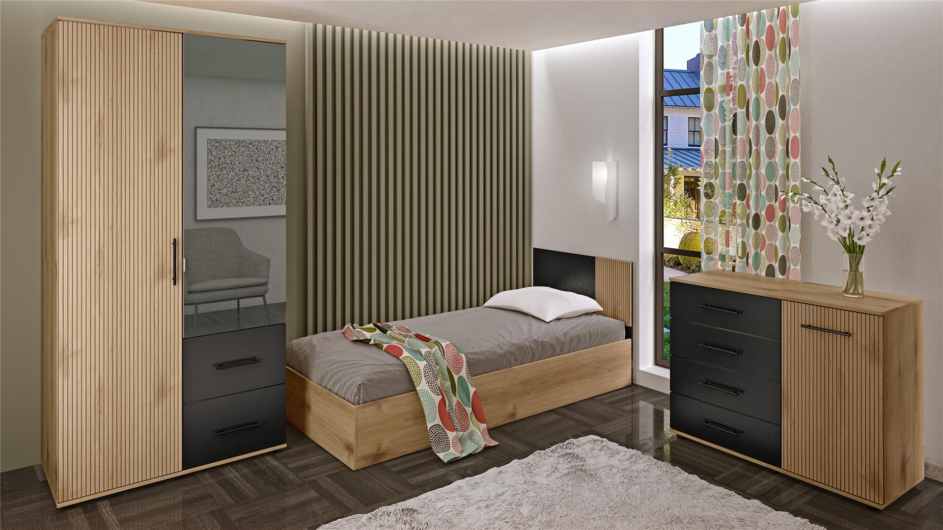 Спален комплект Ламела Л2 е чудесно решение за всеки, който търси практичност, естетика и комфорт в детската стая или дома като цяло. Комплектът осигурява уютна и подредена атмосфера в спалното пространство, без излишни детайли, но с високо ниво на функционалност.