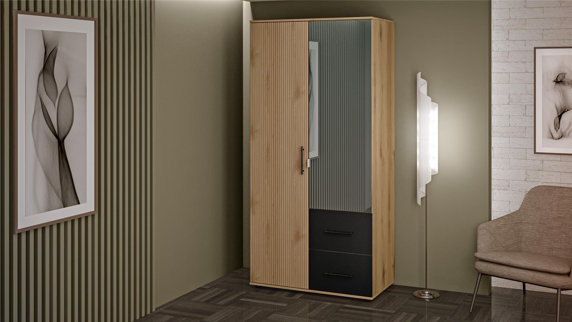 Гардеробът разполага с 4 рафта, които осигуряват място за сгънати дрехи, кутии или други вещи. Лостът за закачалки е идеален за подредба на сака, ризи и рокли, а двете чекмеджета в долната част предлагат допълнително пространство за дребни принадлежности. Огледалото, вградено във вратата, придава завършен вид на модела и прави стаята визуално по-светла и просторна.
