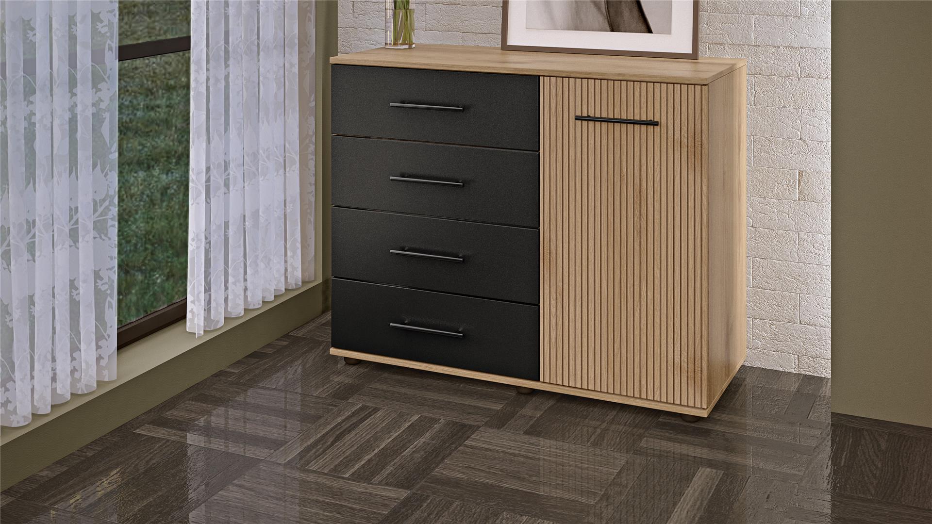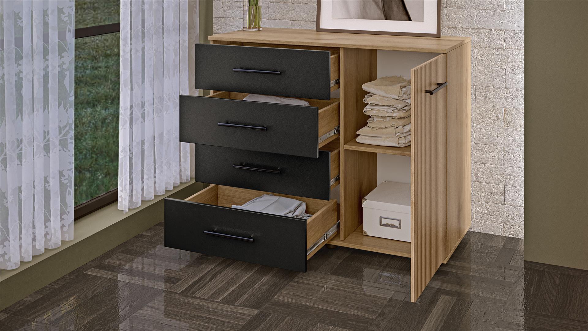 Скринът разполага с четири чекмеджета, разположени вертикално, които предоставят удобство при съхранение на дрехи, бельо, аксесоари или документи. В допълнение има страничен шкаф с вътрешен рафт, осигуряващ още повече възможности за организация – идеален за сгънати дрехи, книги или кутии с вещи. Горният плот е подходящ за поставяне на декоративни елементи или осветление.