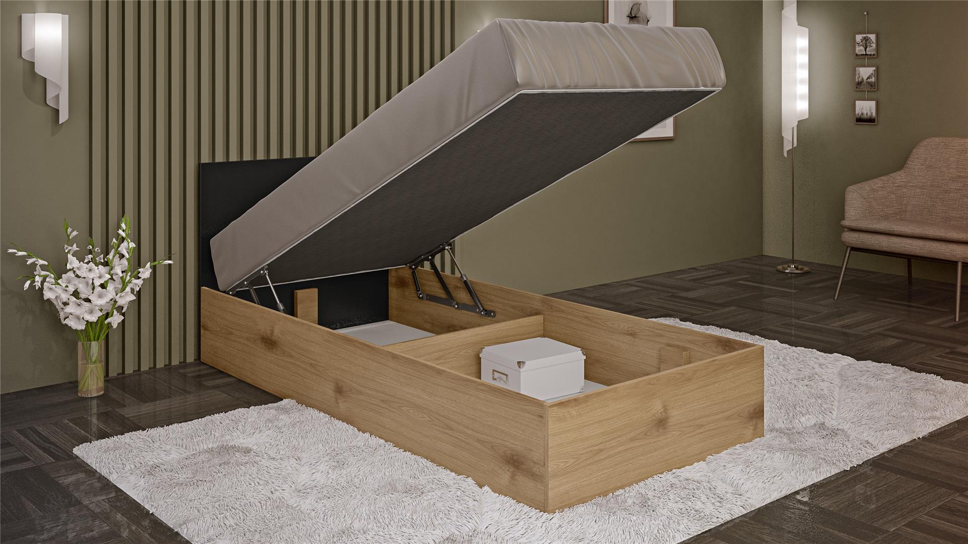 Леглото е с изчистени линии и стабилна основа, подходящо за матрак с размери 90/200 см. Включеният механизъм предлага удобно място за съхранение на завивки и възглавници, сезонни дрехи.