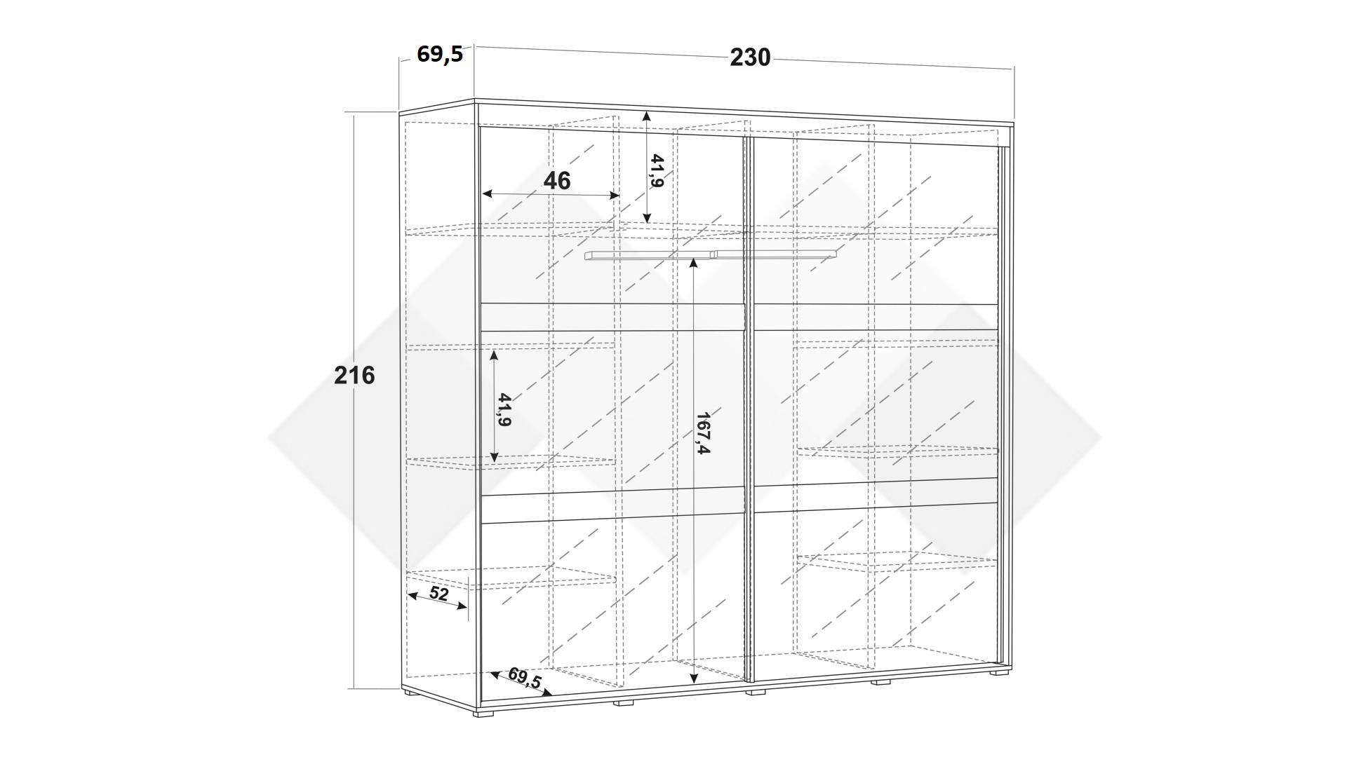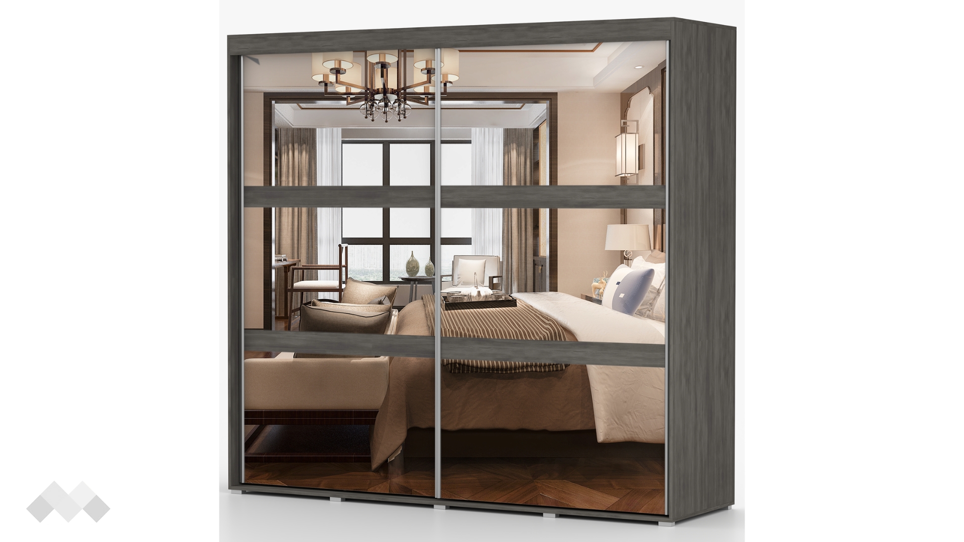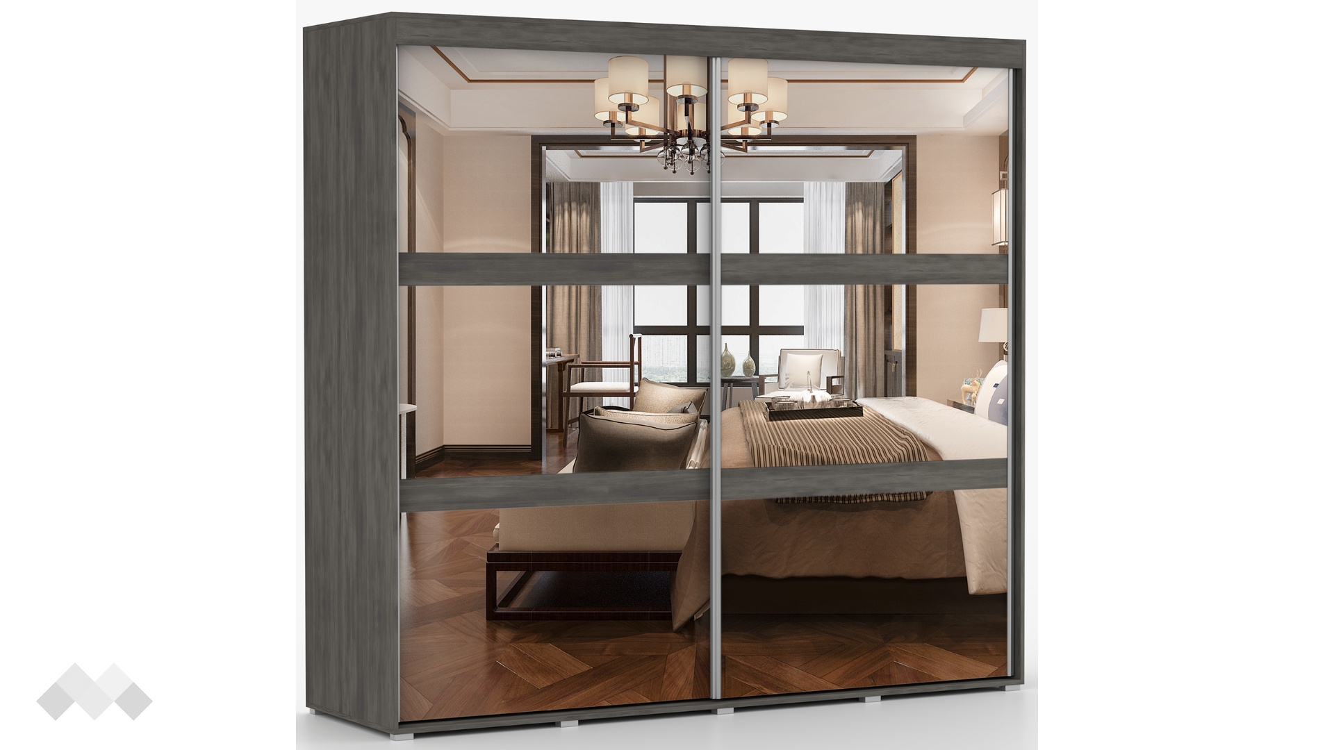 Гардероб с плъзгащи врати Латте е практичен и удобен - плъзгащите врати не изискват място при отваряне. Това го прави подходящ в случаите, когато имаш много дрехи и малко място. Зад вратите ще откриеш просторни десет рафта за сгънати дрехи, малки ел. уреди, сезонни дрехи, а на двата лоста за закачалки ще можеш да закачиш прилежно изгладените ризи или обемни якета. Огледалата на вратите са най-голямата помощ преди да излезеш на разходка - може да огледаш финално своята визия.
